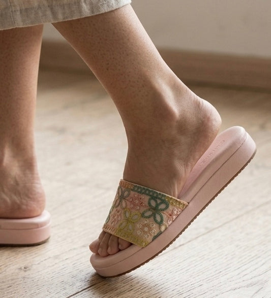 Bloom in every step with the Daisy — adorned with delicate daisy motifs in soft greens, golds, and pinks on a blush pink cushioned base. Perfect for floral dresses, kurtas, and pastel co-ords.