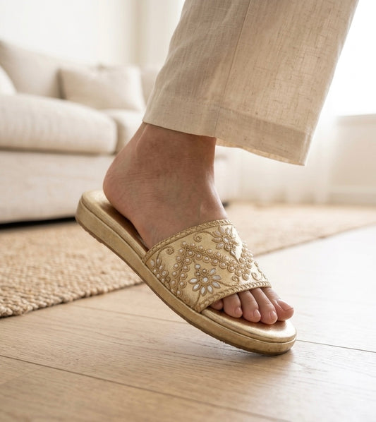 Our embroidered flat sliders bring the beauty of traditional handcraft to your summer wardrobe. Featuring intricate floral motifs, pearl detailing, and aari-zardozi embroidery, these sliders are a celebration of artisanal beauty in everyday wear. If you love embroidered footwear, also explore our Punjabi jutti for women and the Spring Summer Jutti Collection.