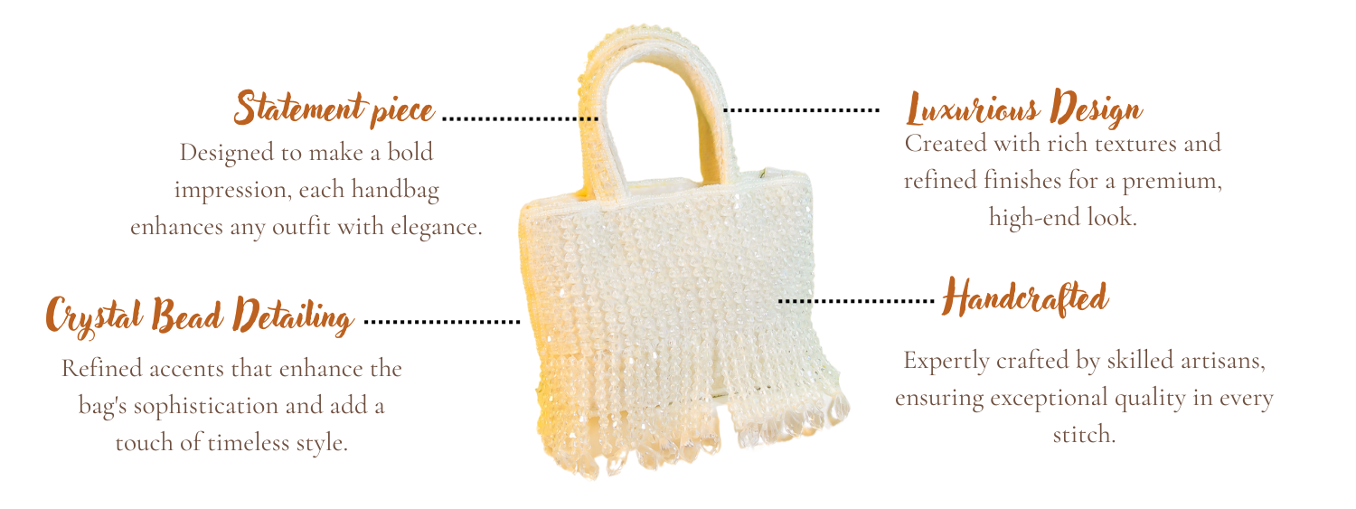 The sun is setting, casting a golden glow over the wedding venue. You step out in your pastel saree, the soft breeze carrying the scent of fresh flowers. As you walk through the crowd, all eyes are drawn to the Alia White Handbag in your hand, its delicate crystal bead detailing catching the light, sparkling with every move you make.It’s more than a bag; it’s your perfect companion, adding that touch of elegance to your look.