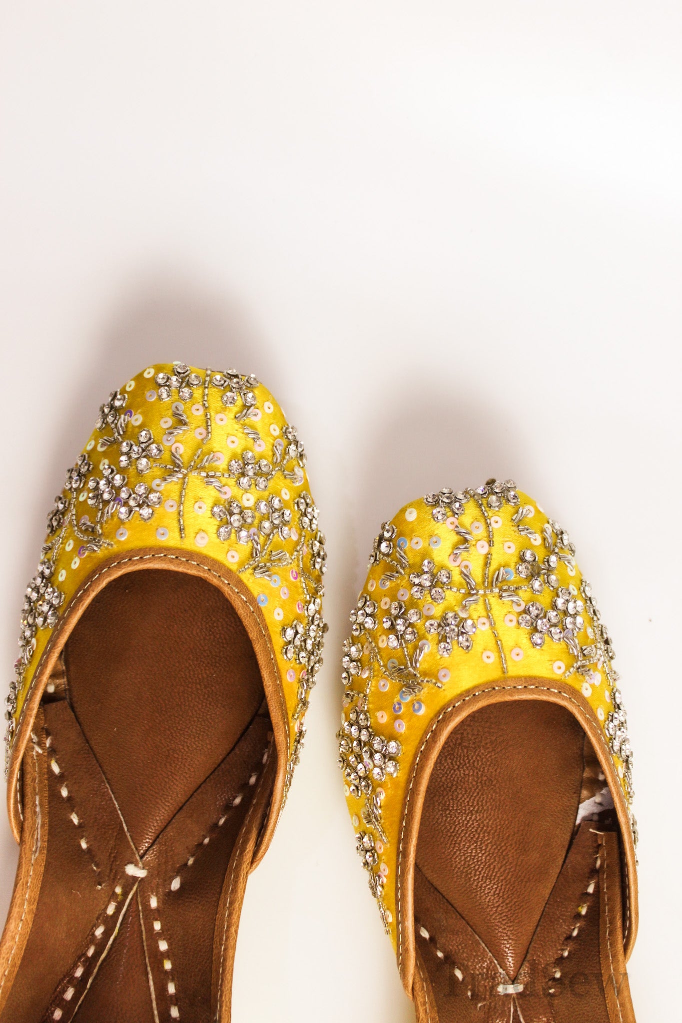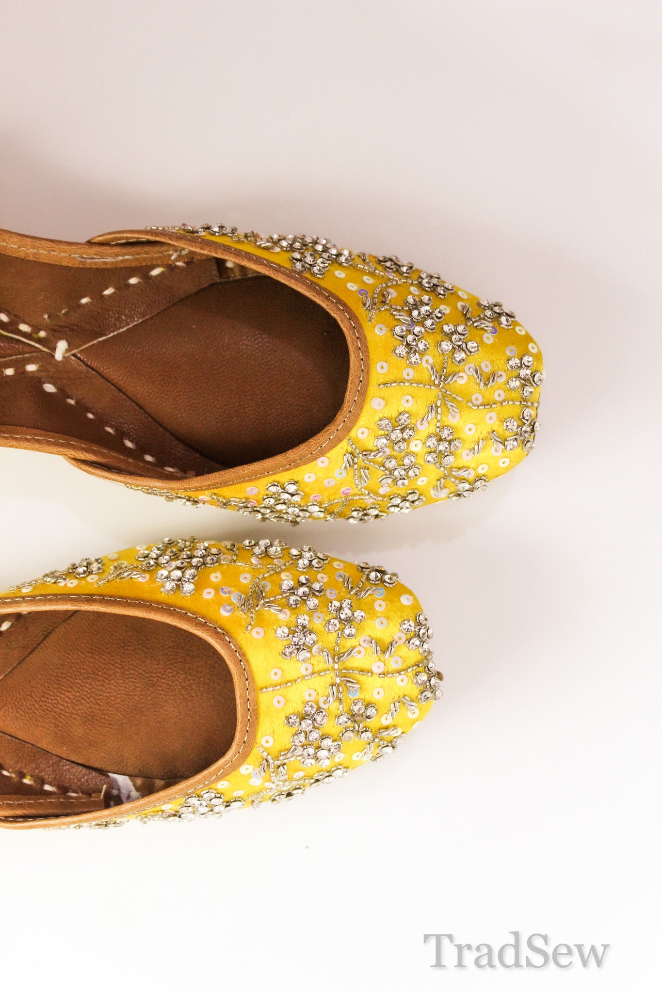 The Anushka: yellow jutti by Tradsew is a burst of sunshine for your wardrobe. This Punjabi jutti for women features a vibrant yellow hue with shimmering silver sequins and white beadwork, making it sparkle with every step. Handcrafted from superior leather, this mojari offers lasting durability and a luxurious feel. The intricate hand-sewn details showcase artisanal craftsmanship, while the padded insole ensures all-day comfort. Perfect for any occasion, the Anushka jutti combines style and comfort effortlessly.