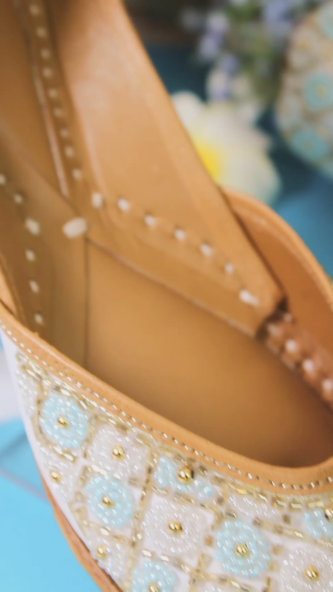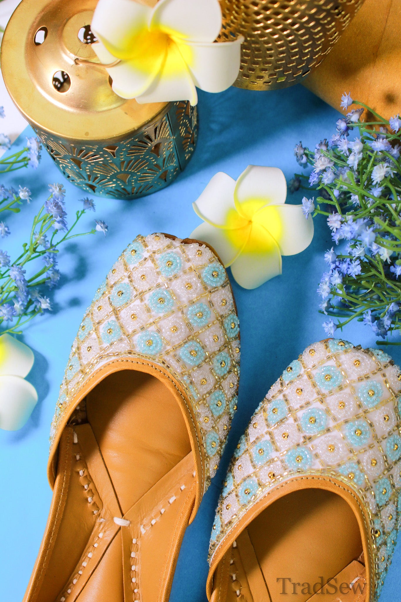 The Aqua Mosaic Beaded Jutti from Tradsew celebrates the timeless beauty of mosaics, transforming it into a stunning piece of wearable art. Featuring striking aqua blue and gold beads, this Punjabi jutti for women boasts intricate patterns that evoke grandeur. Handcrafted by skilled artisans, each mojari is unique, with soft leather and a padded insole ensuring luxurious comfort. Adorn your feet with this perfect blend of heritage craftsmanship and modern style.