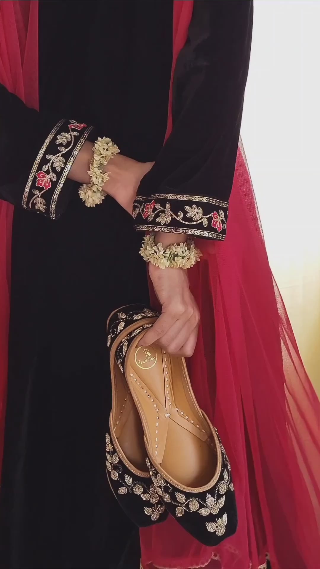 This jutti features exquisite Dabka work, a specialized craft where artisans create intricate leaf and flower motifs. These details enhance its overall aesthetic appeal. Designed with your comfort in mind, this jutti includes soft padding to ensure your feet are comfortably supported throughout the day. Tradsew is committed to quality and comfort, making every jutti a luxurious and practical choice for any occasion.