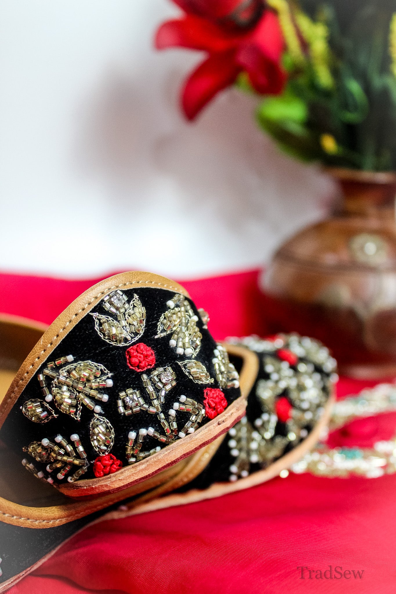 This jutti, adorned with cutdana work, showcases meticulous craftsmanship where artisans create delicate flower motifs that stand out against a sleek black backdrop. The red accents incorporated into the design are reminiscent of the vibrant hues of the bulbul bird, adding a touch of natural elegance. It is further enhanced by a soft padding within the shoe, ensuring that comfort is prioritized for the wearer. Upholding Tradsew's commitment to quality and comfort, this jutti is both stylish and practical for daily wear.