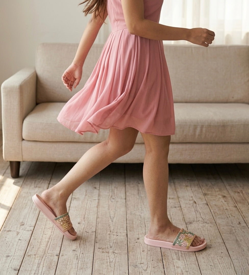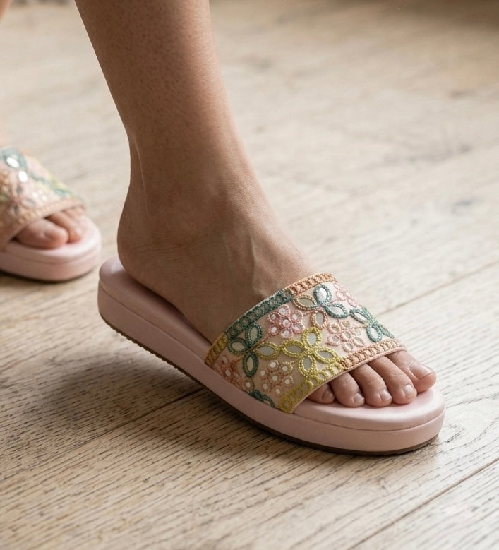 Bloom in every step with the Daisy — a dreamy flat slider adorned with intricate floral embroidery on a blush pink base. Handcrafted with delicate daisy motifs in soft greens, golds, and pinks, this slider is made for women who carry a little garden wherever they go.