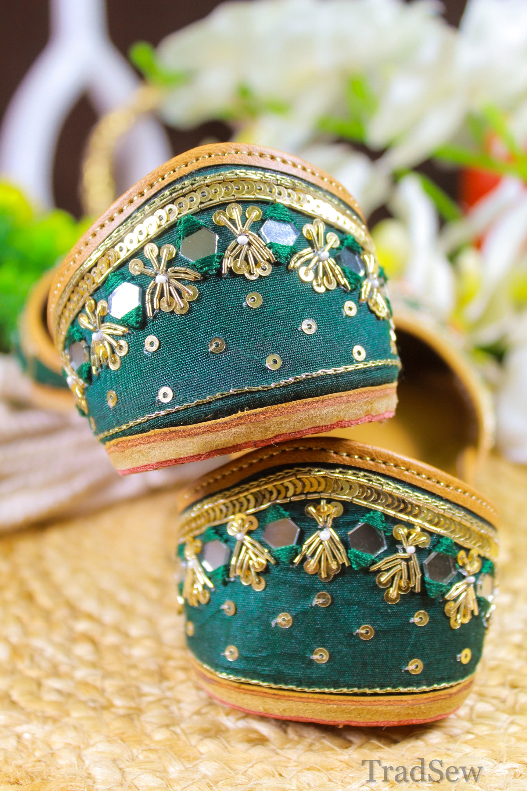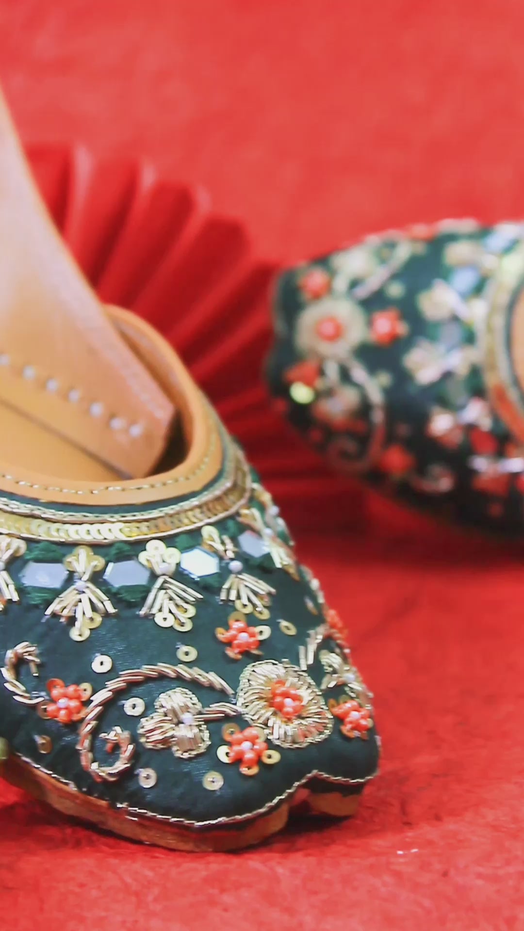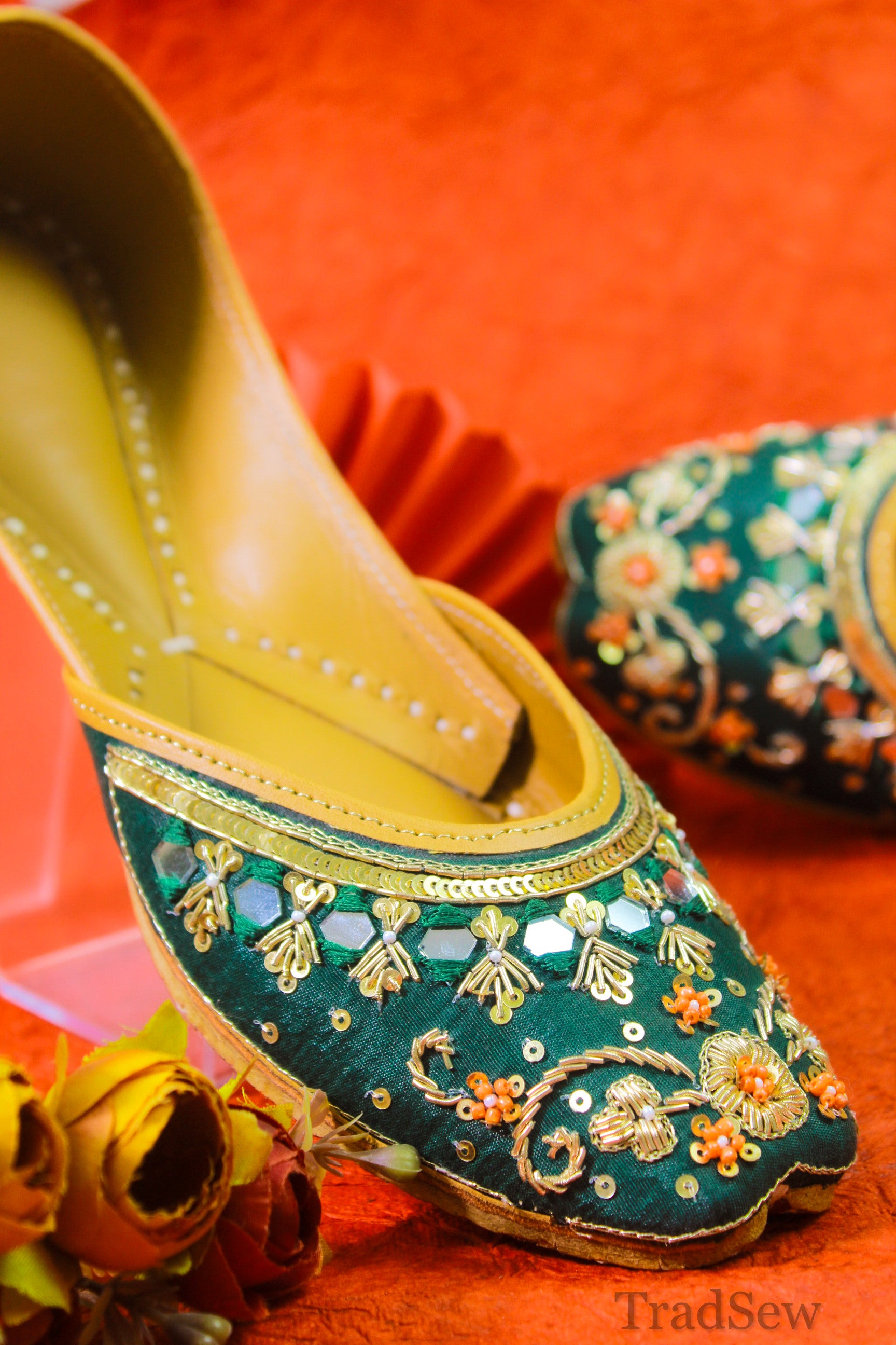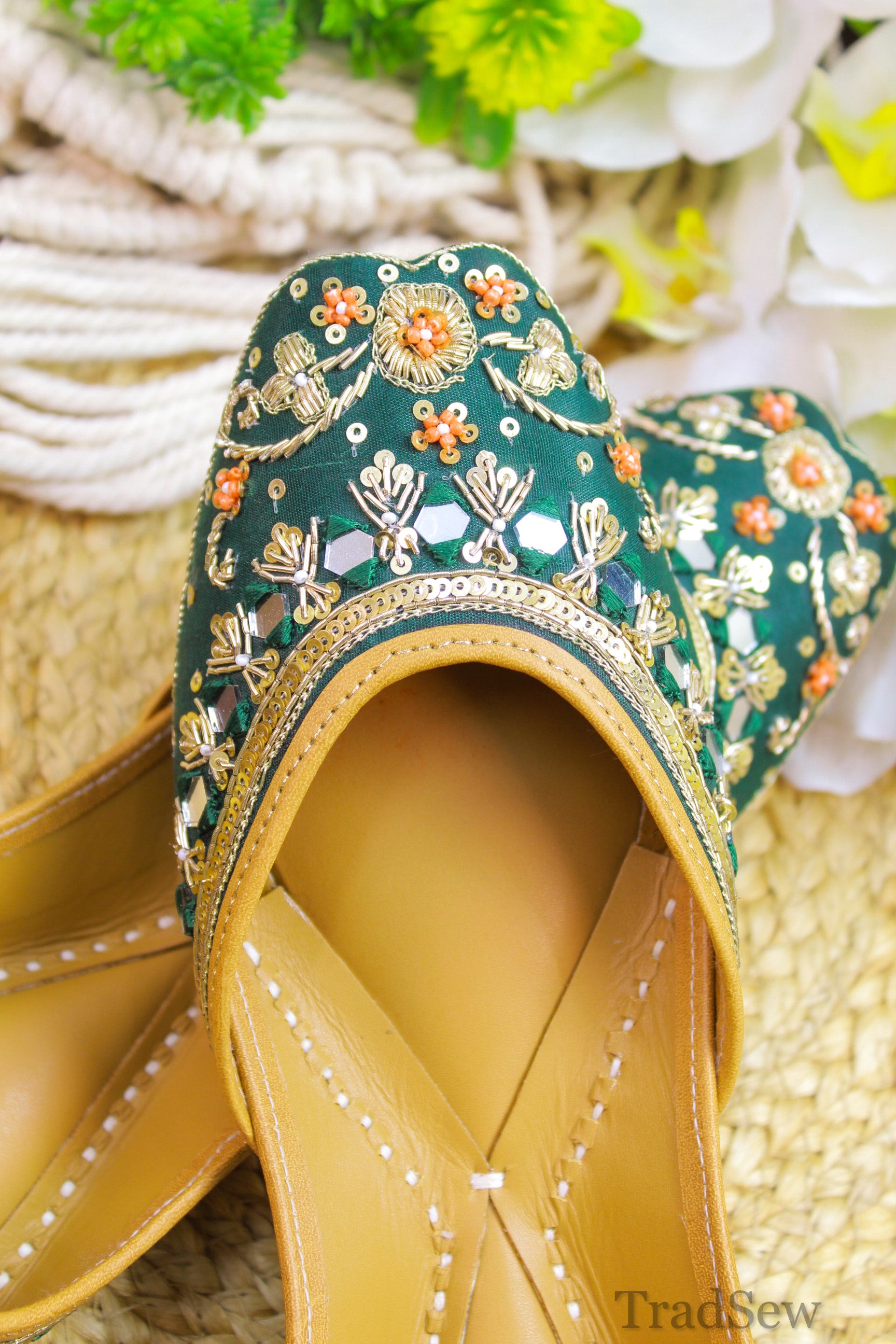 The Fareedan Green Jutti is a masterpiece in the collection of Punjabi juttis for women, showcasing traditional craftsmanship with a modern twist. This elegant footwear features exquisite golden zari work and detailed glasswork on a deep green canvas, beautifully contrasted with vivid orange floral designs. The intricate embroidery and rich color palette make this Punjabi jutti for women an ideal choice for festive wear, enhancing any ensemble with its sophisticated charm and eye-catching appeal.