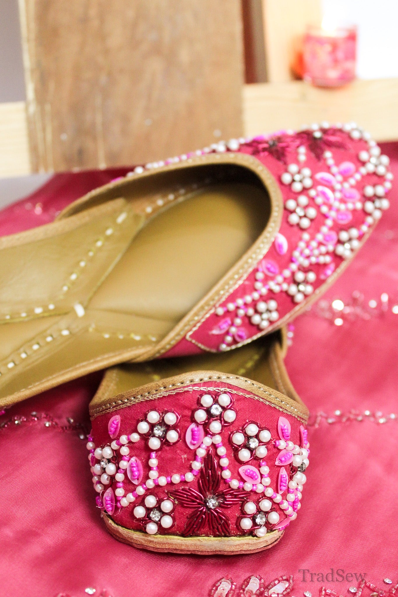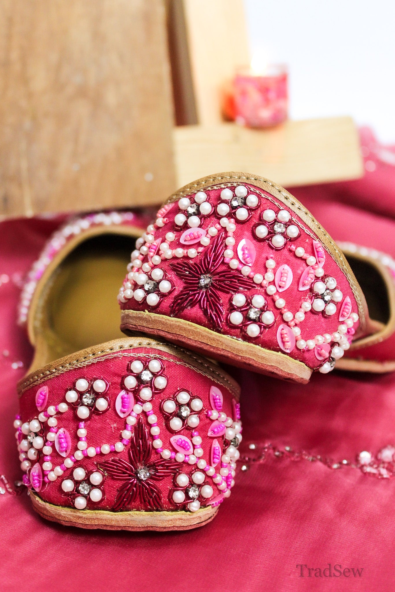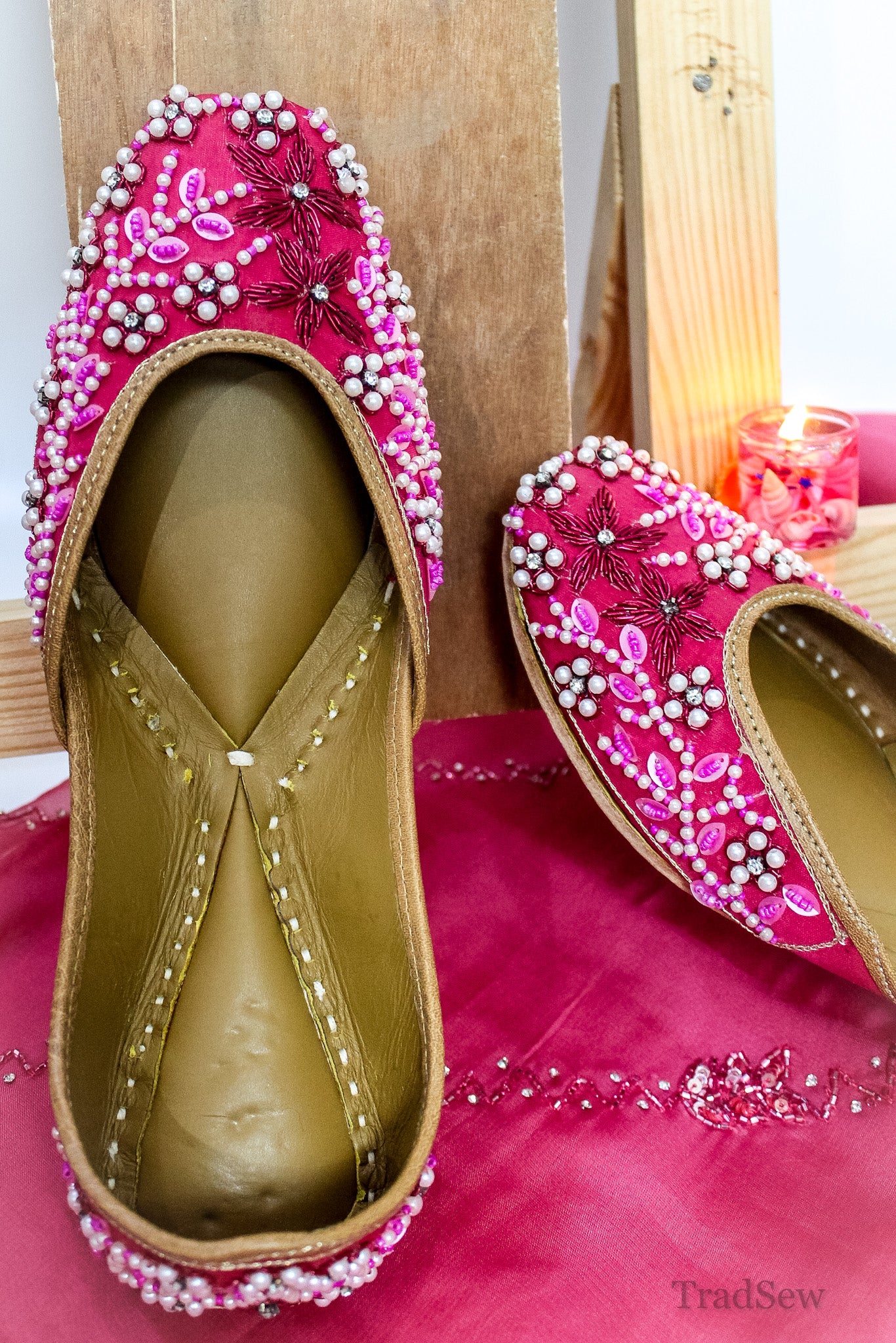 The Fuchsia Fantasy Beaded Juttis by TradSew, a stunning creation that blends traditional Punjabi jutti craftsmanship with modern flair. The bold fuchsia canvas sets the stage for intricate beadwork, with luxurious pearls and sparkling stones meticulously arranged to create a dazzling visual effect. Handcrafted with care, these mojari juttis feature supple leather craftsmanship that promises both longevity and opulence. The padded footbed ensures unmatched comfort, making them perfect for extended wear at weddings, celebrations, or even to elevate your everyday style. With a slip-resistant sole for added durability, these juttis are not just an accessory but a statement piece that embodies the cultural richness and quality commitment of TradSew.