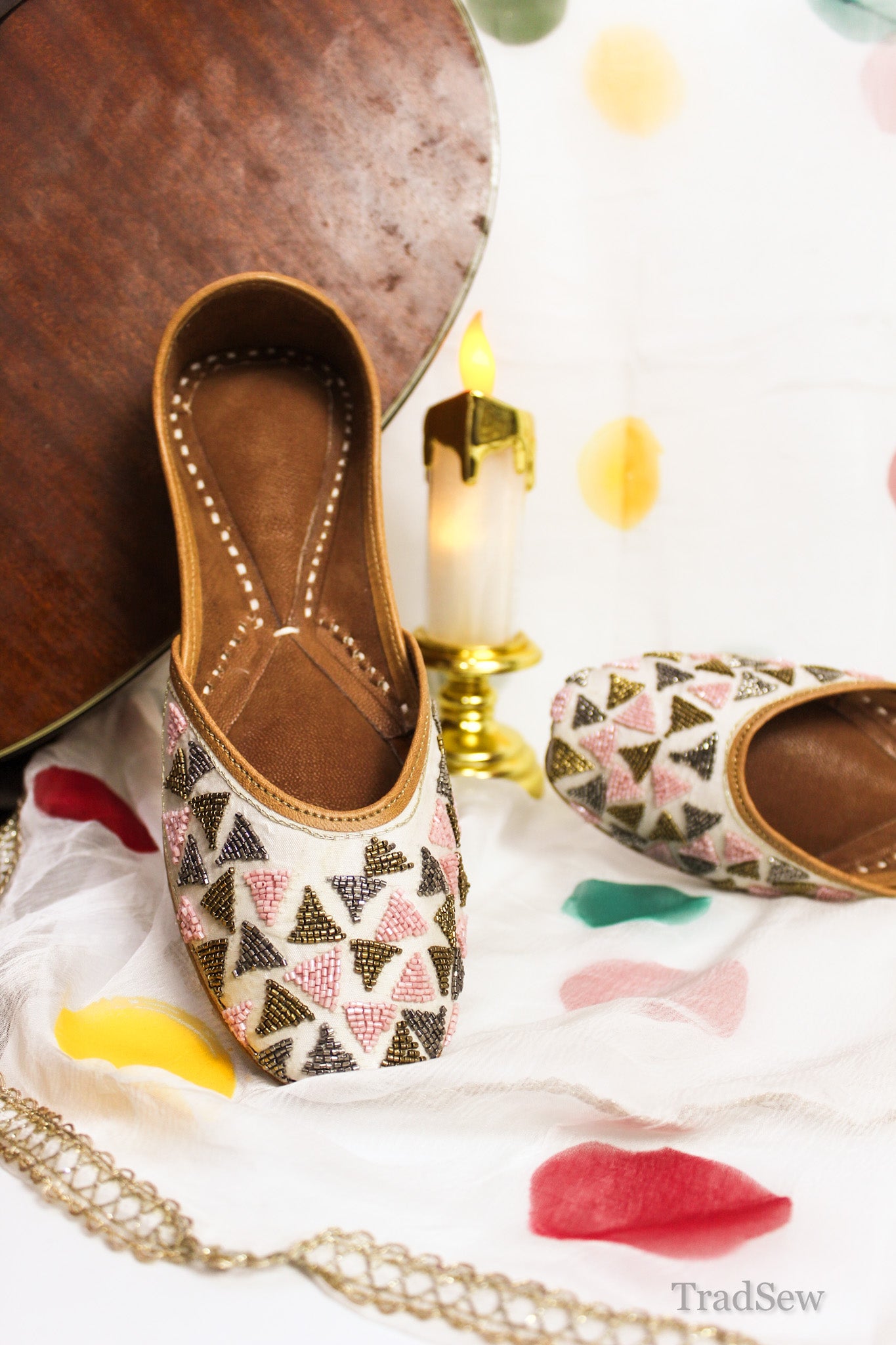 The Trikon White Punjabi Jutti for Womenis a handcrafted mojari showcases a unique triangle design with stone embellishments, adding a touch of elegance to your ensemble. With soft padding for maximum comfort, it embodies Tradsew's promise of quality and comfort in every step.