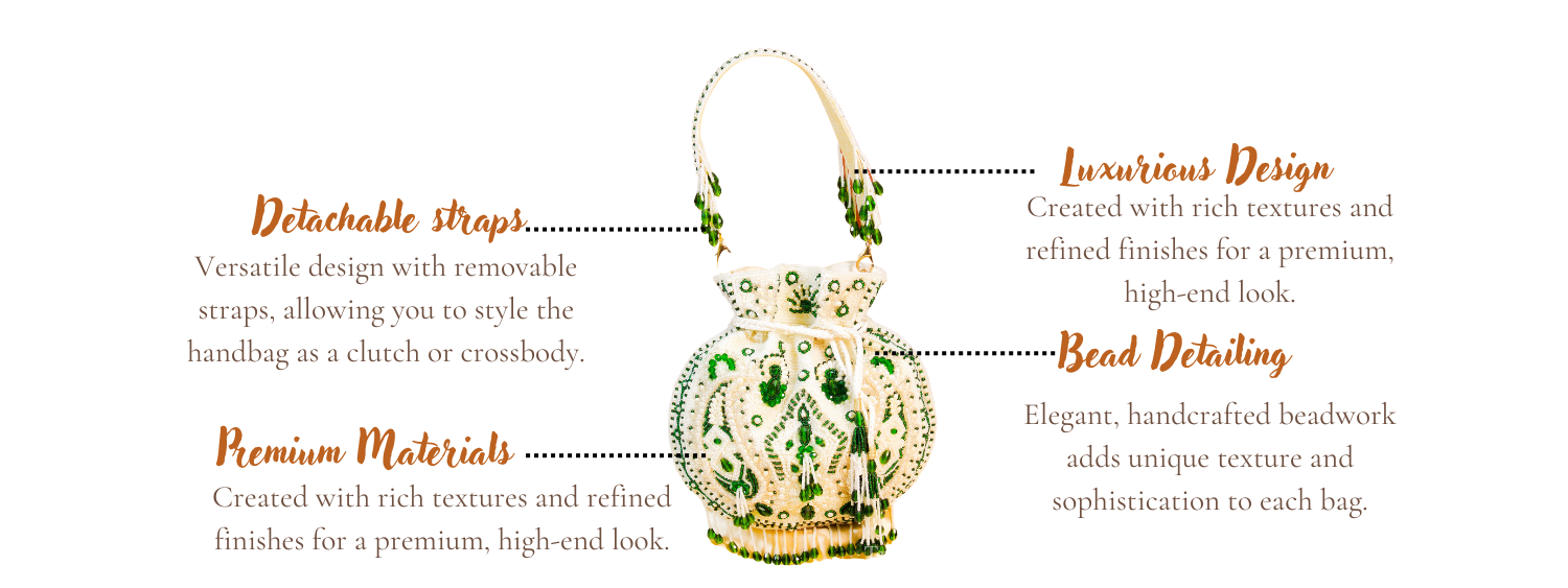 At the wedding, the Lyla White Potli immediately catches everyone’s eye with its elegant white and green beading. Friends ask in awe, “How is it so pretty and holds so much?” Compact yet surprisingly spacious, it fits your essentials : phone, lipstick, mirror, keeping you effortlessly prepared from ceremony to dance floor. Light and stylish, the Lyla Potli is the perfect companion, blending elegance with practicality, making this day even more memorable.