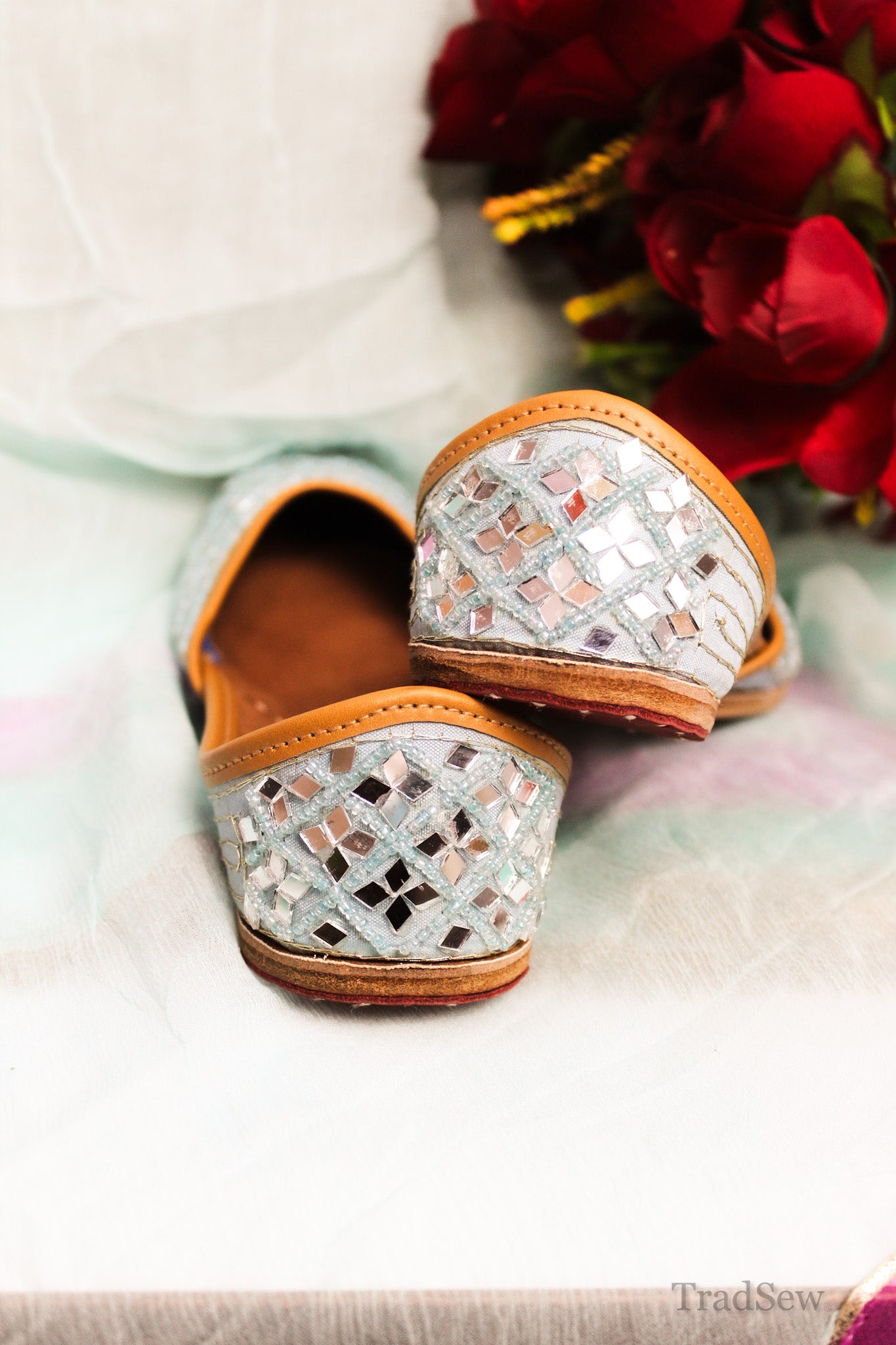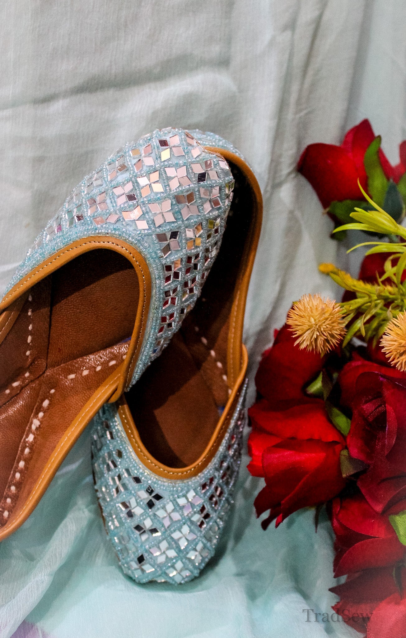 The Peach Glam Mirrorwork Jutti from Tradsew is a fusion of classical artistry and modern-day comfort. Adorned with eye-catching mirrorwork, this jutti's light blue backdrop captures the essence of understated elegance. The genuine leather material ensures a luxurious feel and resilience for sustained use.