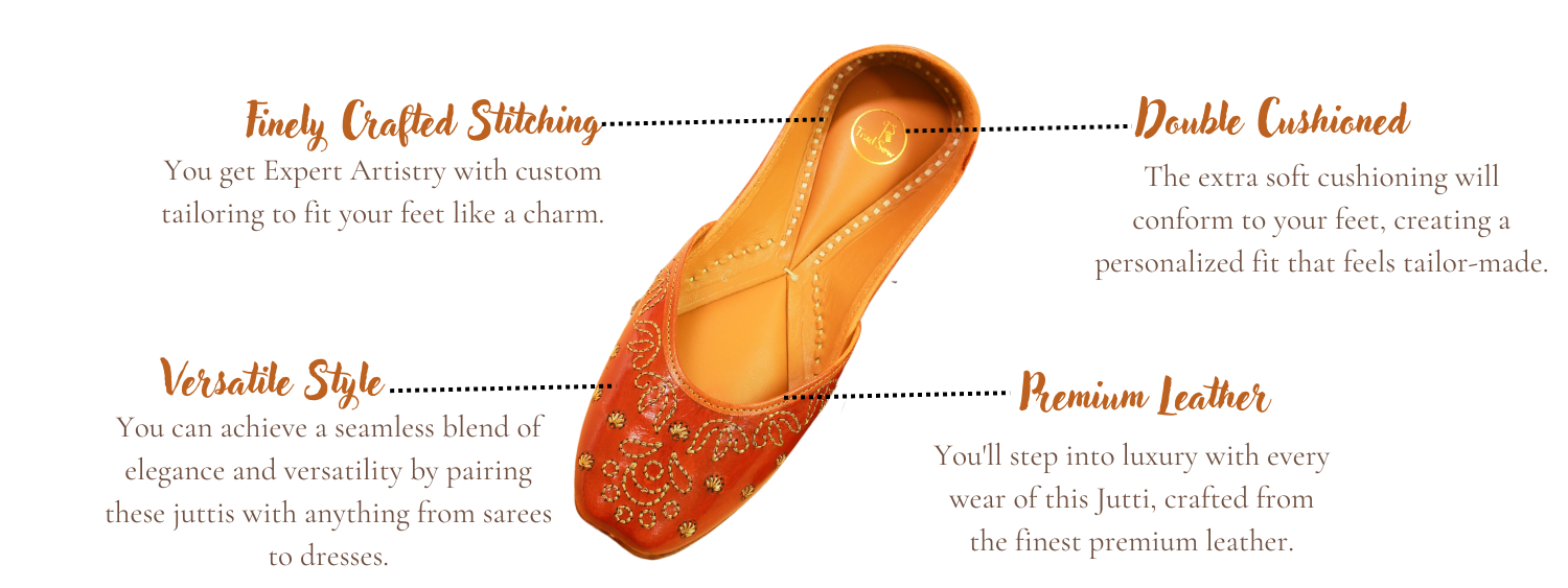 This exquisite Punjabi jutti for women is made from premium leather, ensuring exceptional comfort and durability. It is a stylish juti for ladies and suitable for various occasions, from casual outings to festive celebrations. With its soft padding, this mojari provides all-day comfort.