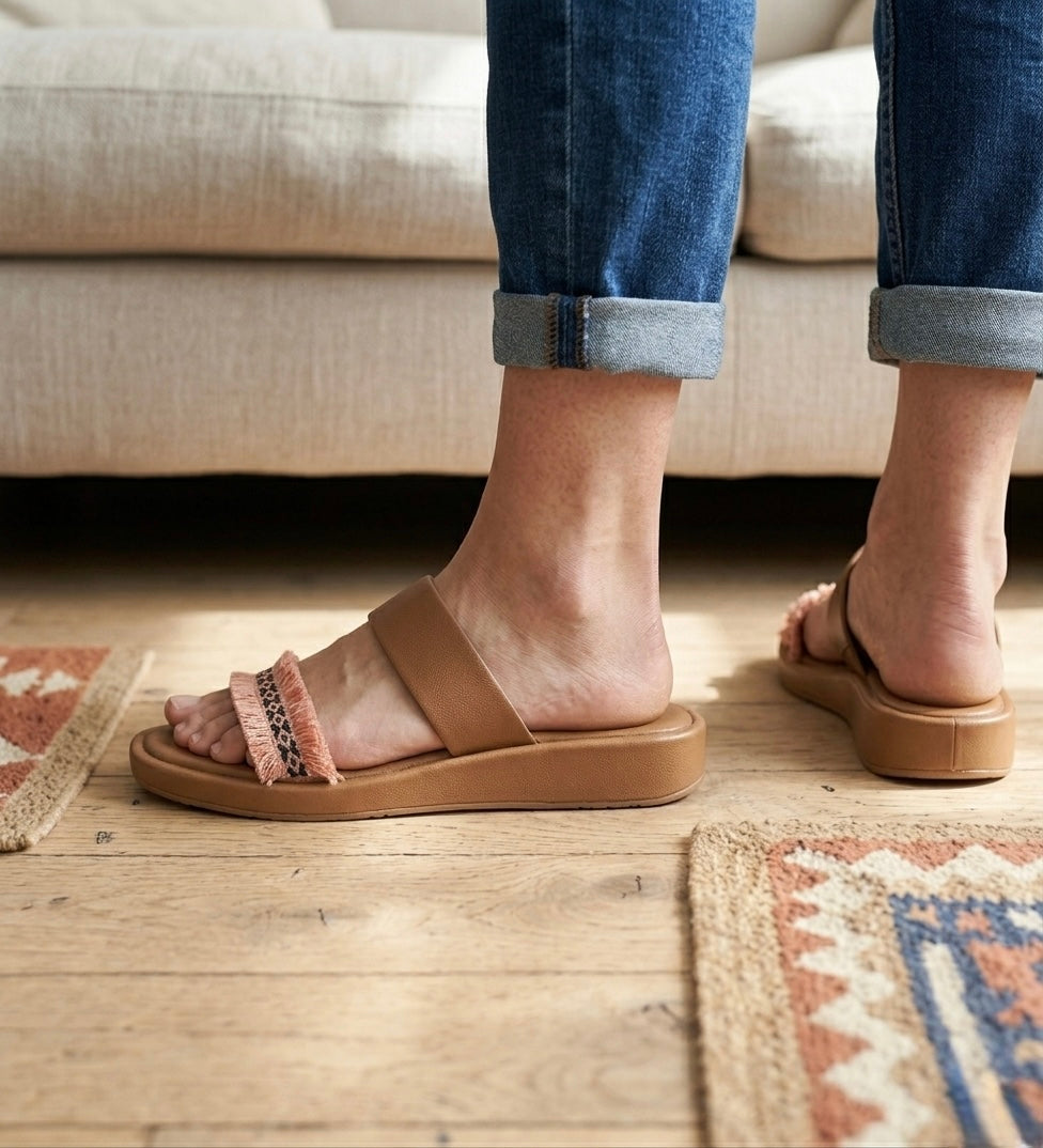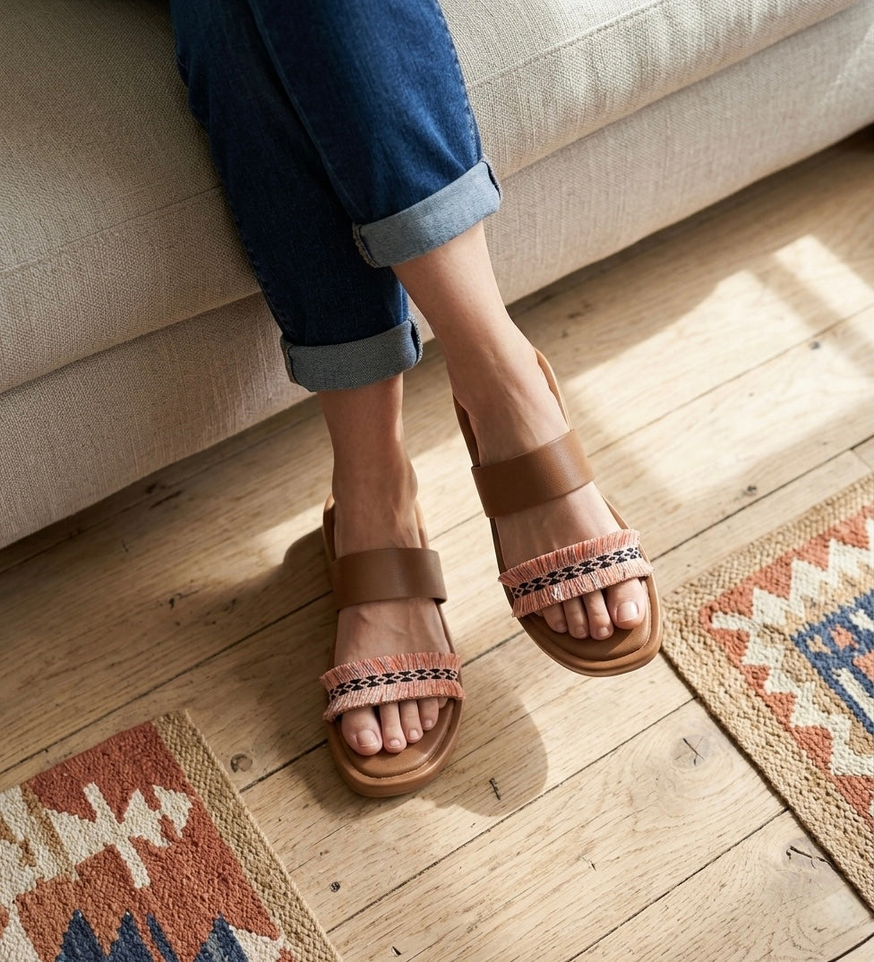 Wander freely in the Morocco — a dual-strap flat slider inspired by the sun-soaked souks and earthy textures of North Africa. A smooth tan leather back strap pairs with a fringed tribal-print toe strap, creating a boho-chic look that feels as good as it looks.
