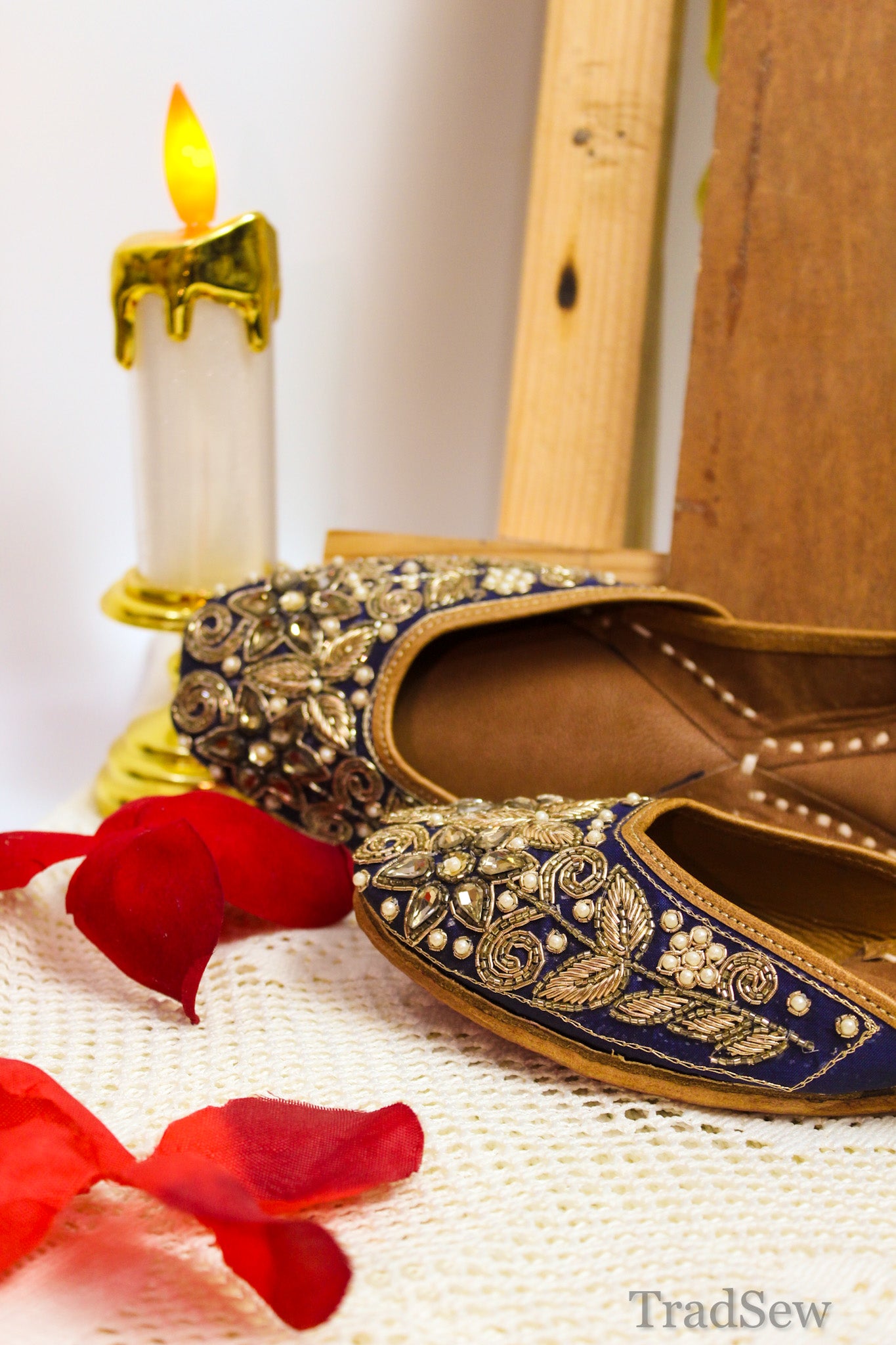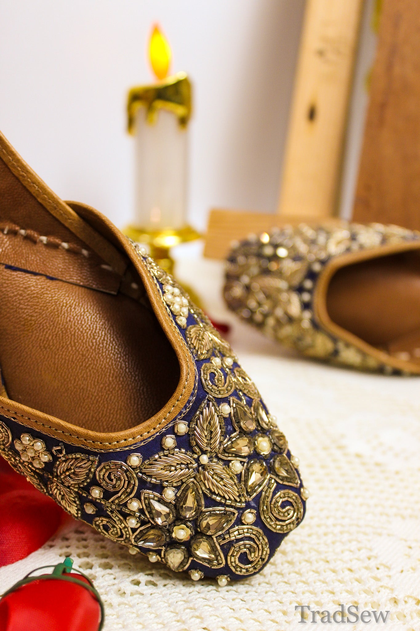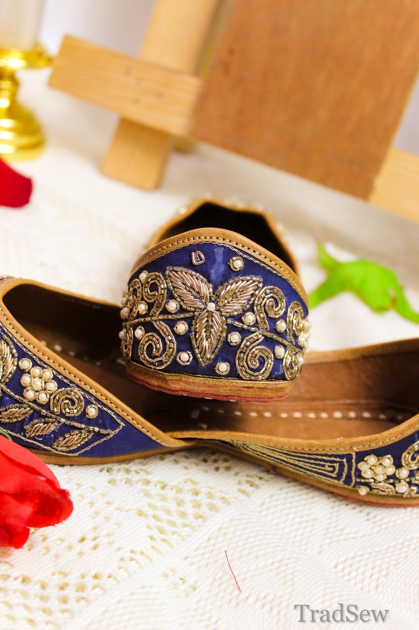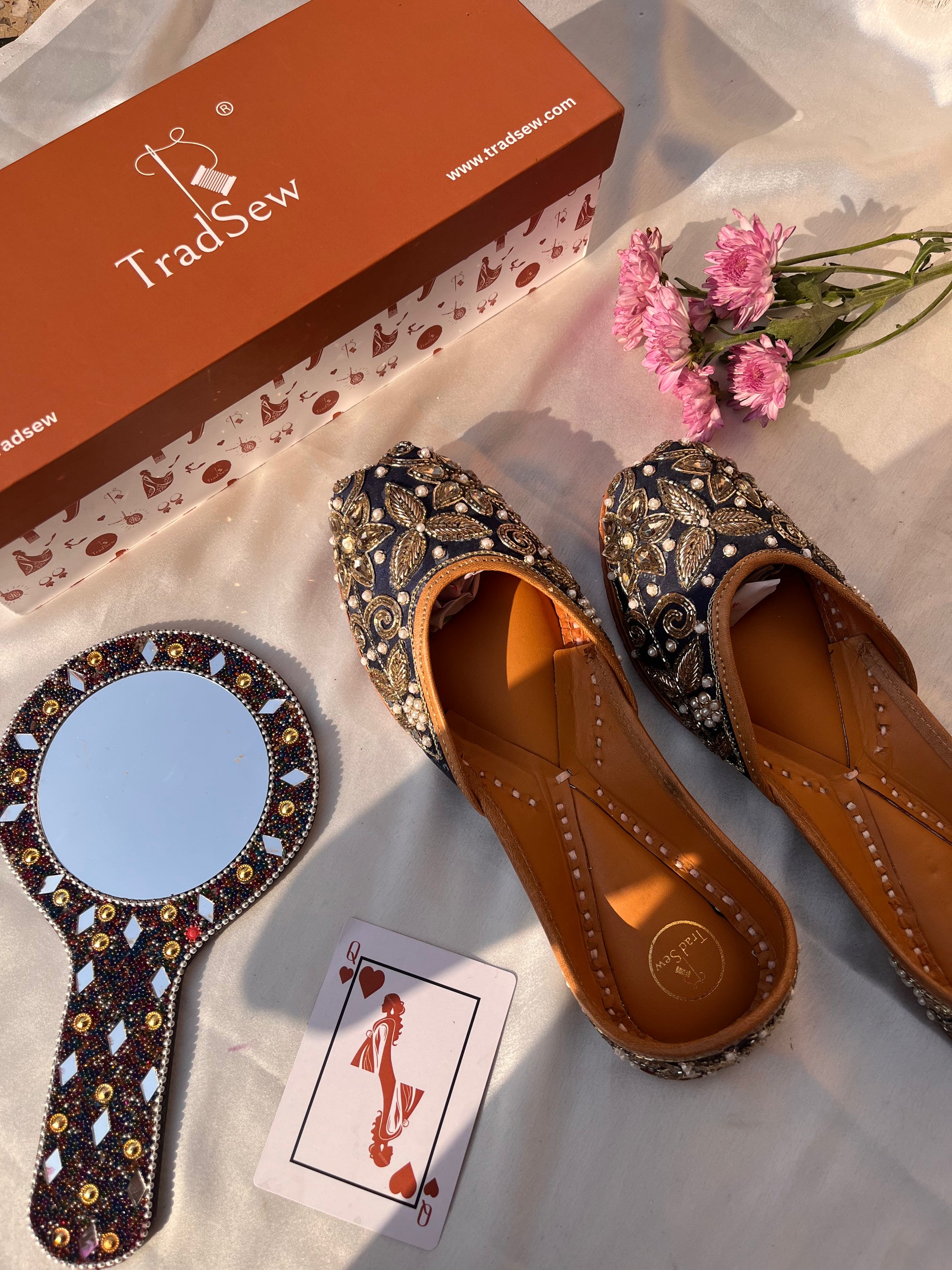 The Aabha: Navy Gold Ornamental Jutti from Tradsew is a testament to opulent design and comfort. This Punjabi jutti for women is designed with you in mind, blending traditional charm with modern elegance. The intricate gold filigree on navy blue is perfect for adding a touch of sophistication to any outfit. These handcrafted mojari feature genuine leather that molds to your feet for ultimate comfort, with soft padding to keep you going through long celebrations. Tradsew brings you a jutti that's not just beautiful but durable, making every step a stylish one.
