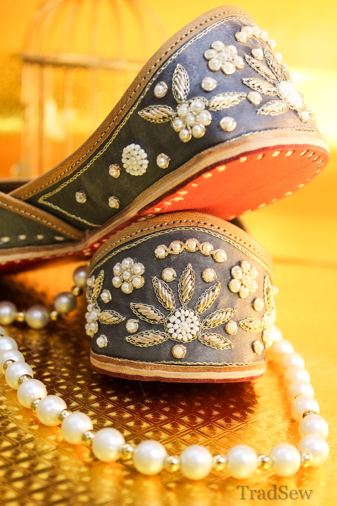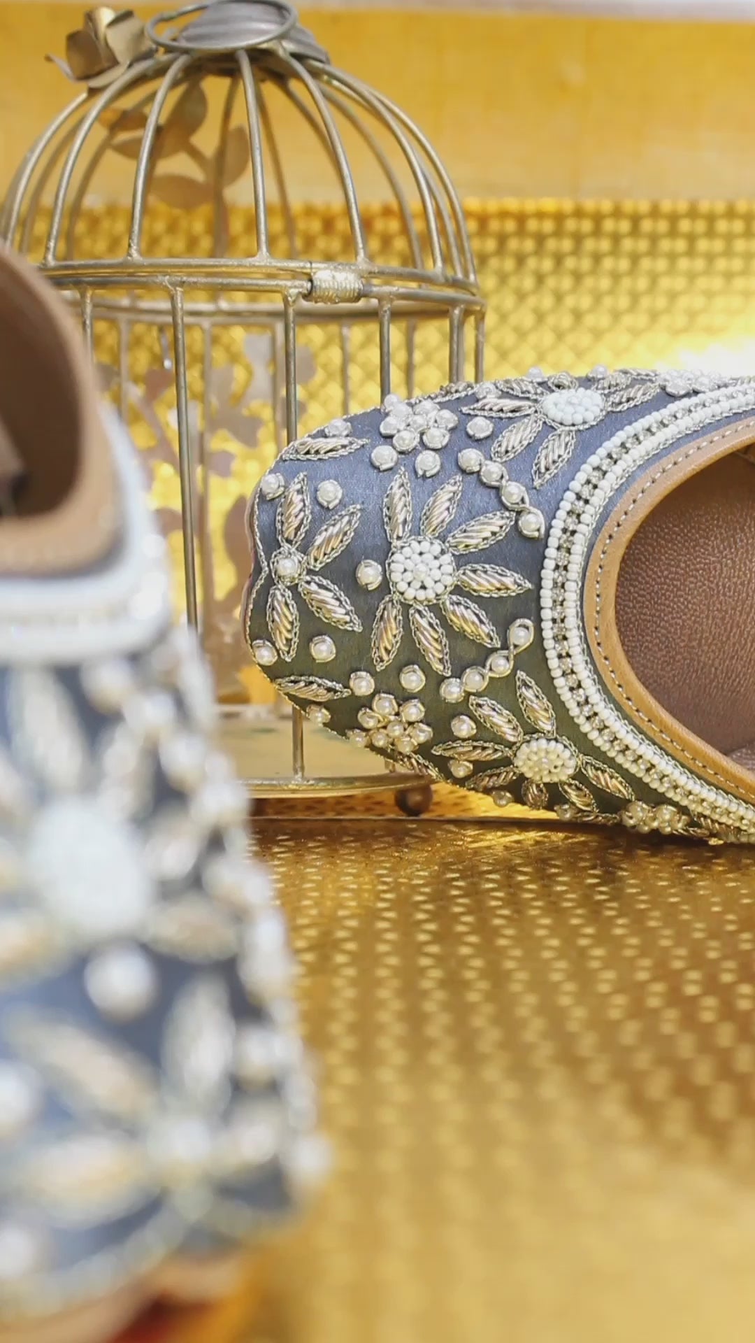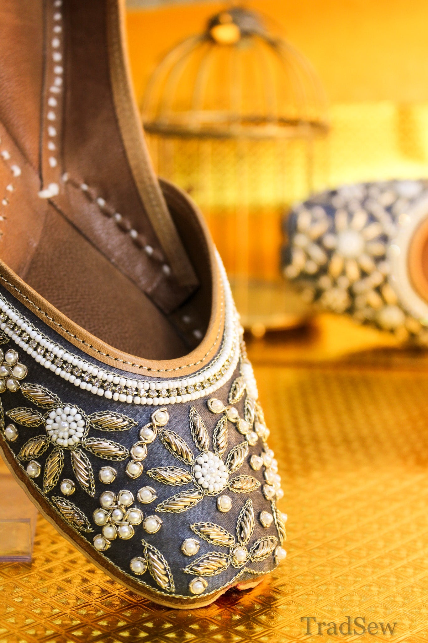 The Nihal Grey Punjabi Jutti by Tradsew is a perfect blend of elegance and comfort. Adorned with a stunning stone design and embellished with intricate white and golden flower embroidery, this mojari is a statement piece for any occasion. The soft padding ensures your feet stay comfortable all day. With Tradsew's promise of comfort and quality, this punjabi jutti for women is more than just footwear it's a stylish companion that makes you stand out.
