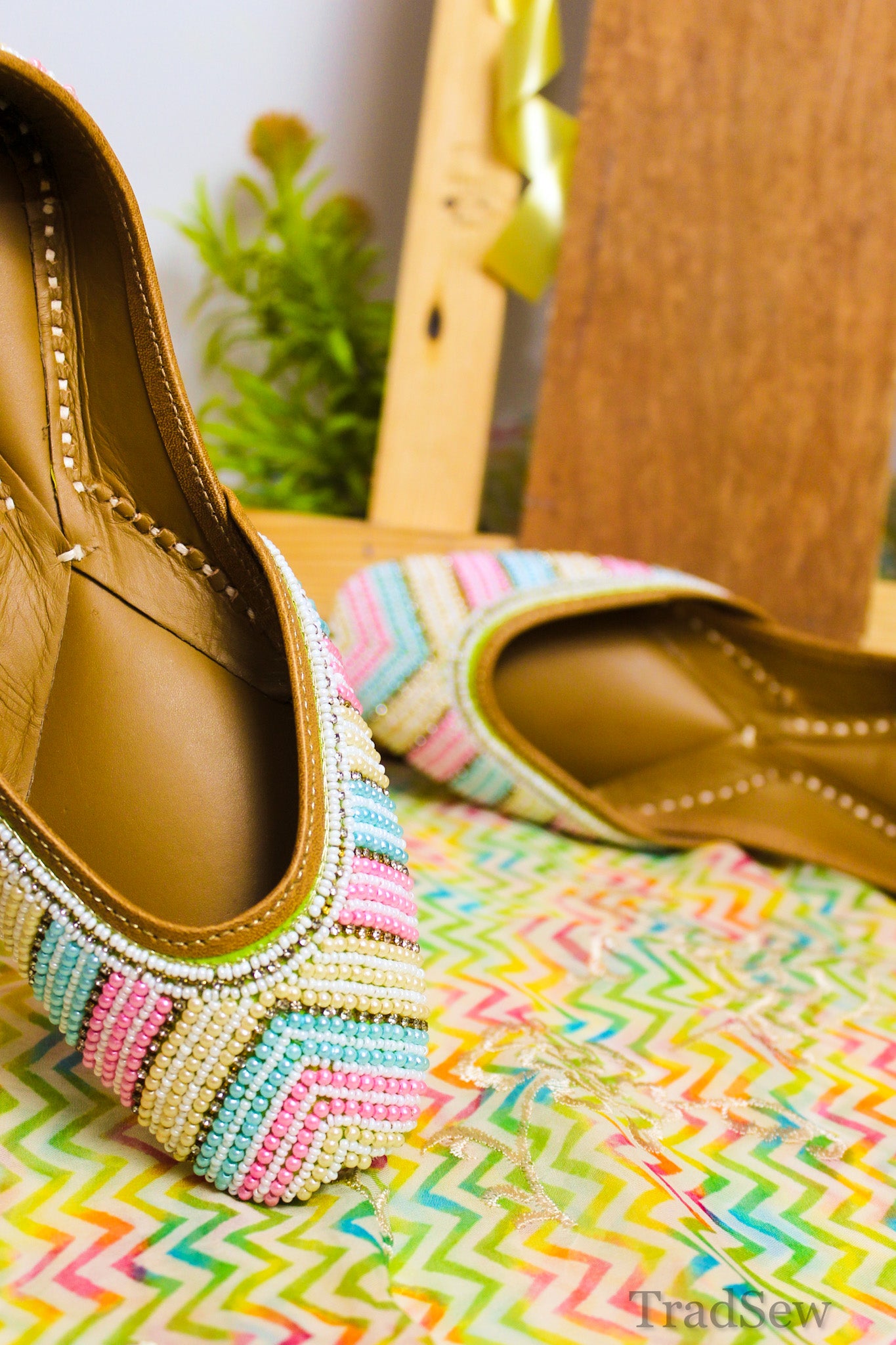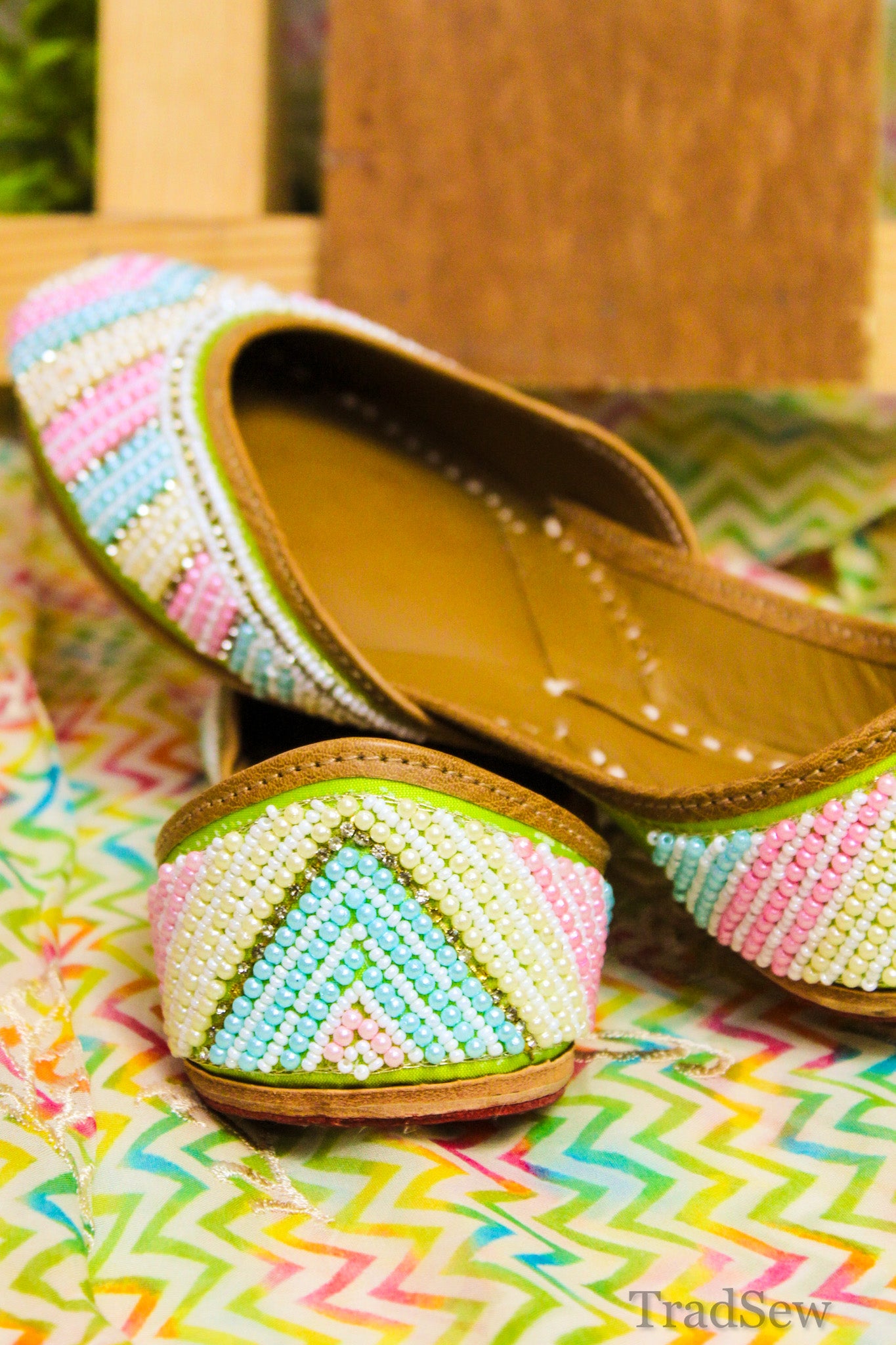 The Pastel Chevron Punjabi Jutti for Women is a the perfect blend of tradition and style. Handcrafted with a soothing pastel chevron pattern, this mojari features elegant beadwork and premium leather craftsmanship. Designed with a cushioned footbed, it offers all-day comfort, making it ideal for any occasion.