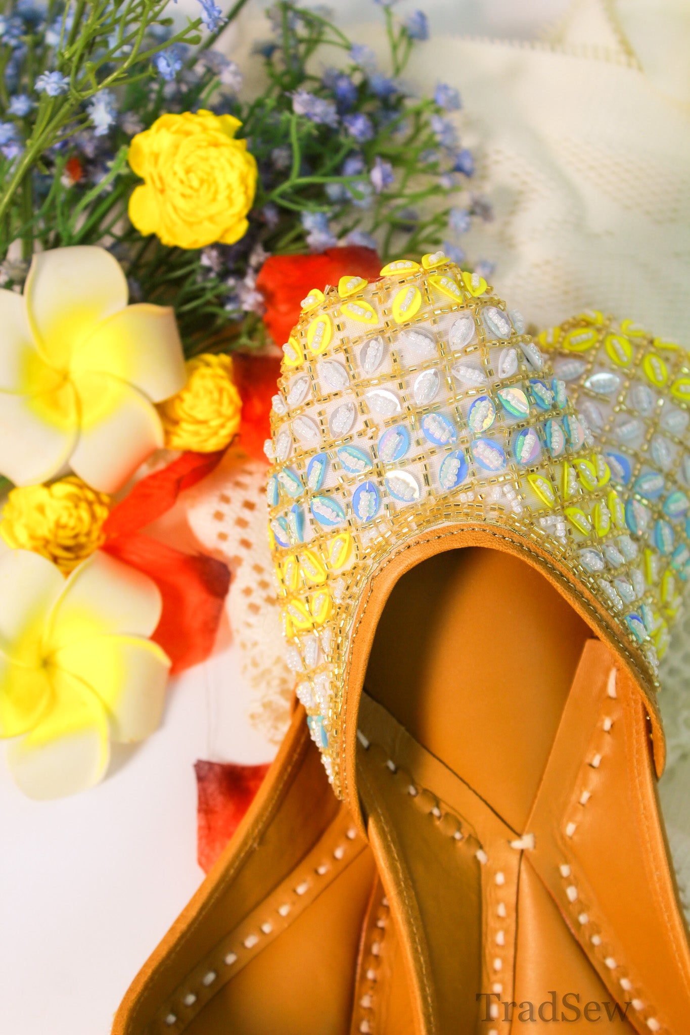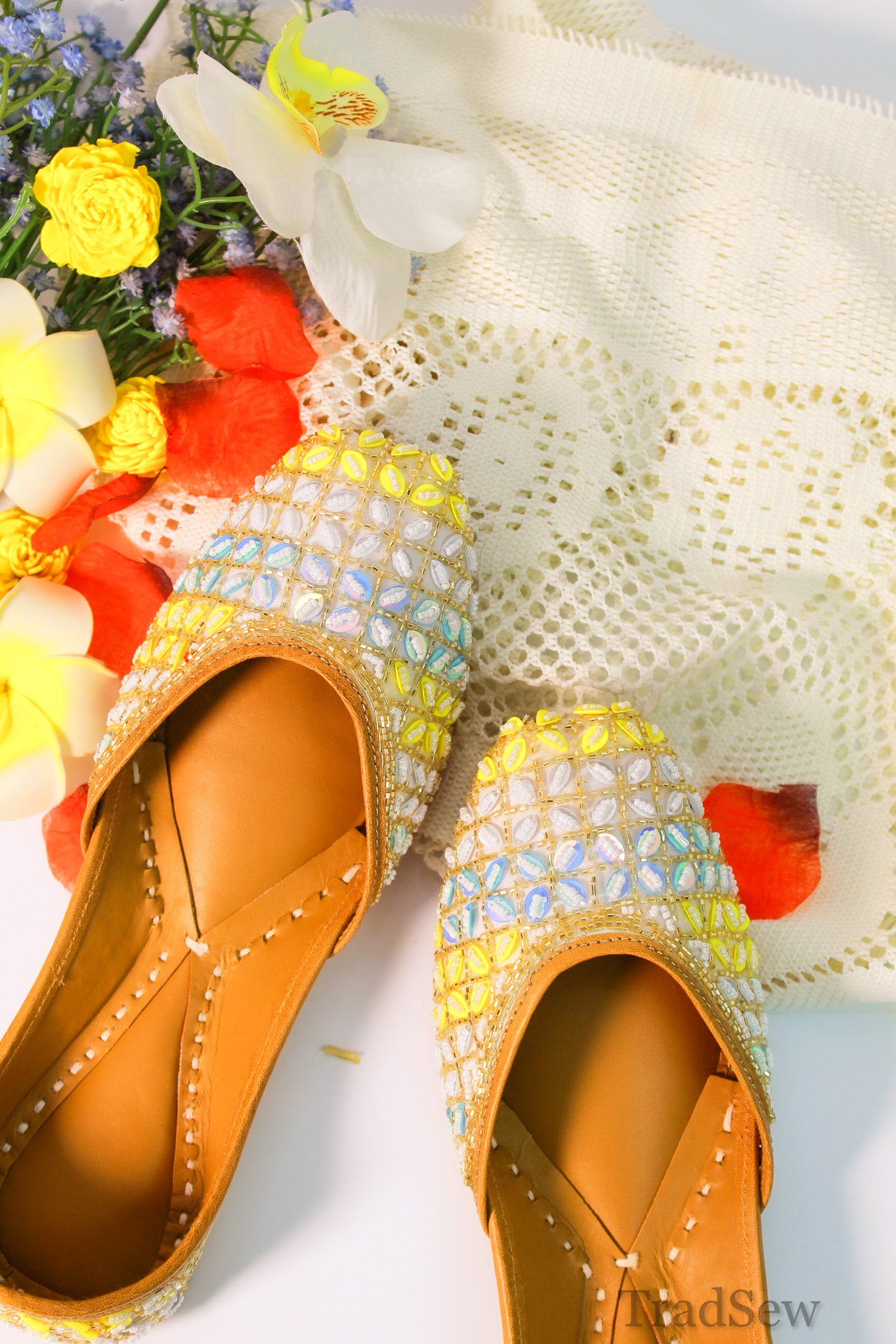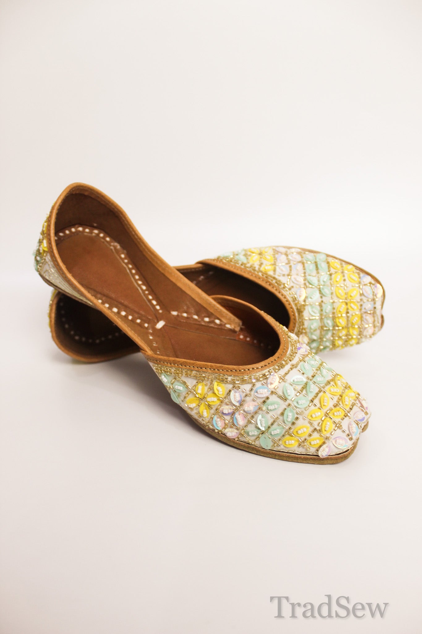 The Pastel Gemstone Leather Jutti is a Punjabi jutti for women from Tradsew. Handcrafted with precision, this mojari feature delicate pastel embellishments and sparkling sequins, creating a stylish juti perfect for any occasion. The fine leather crafting ensures durability, while the cushioned insole provides all day comfort.