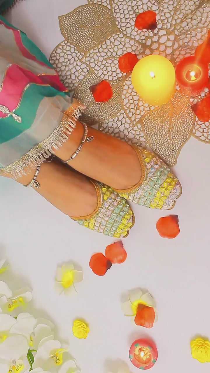 Note: The handcrafted nature of these juttis means each pair is unique, and there may be slight variations in the design. Colors may also vary slightly from the photographs due to lighting and individual screen settings.