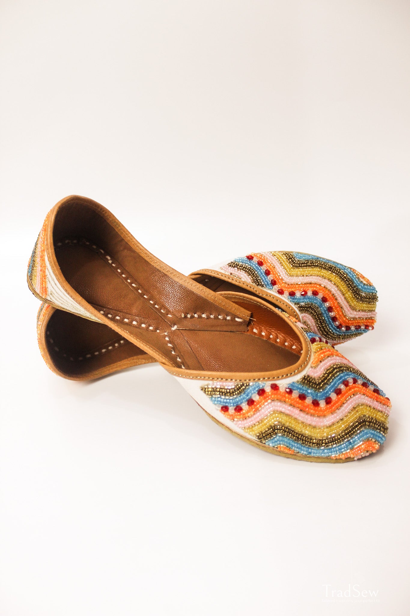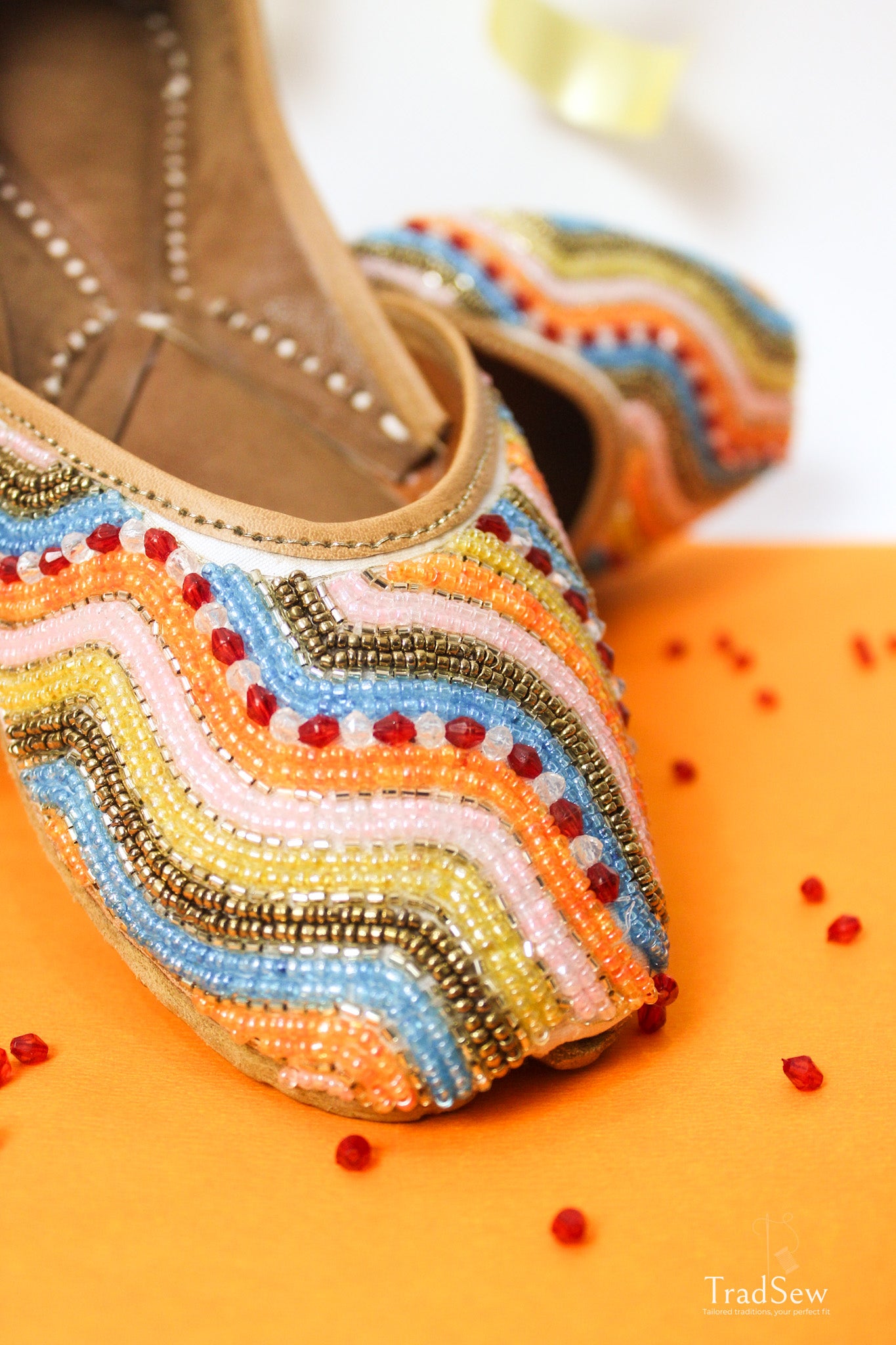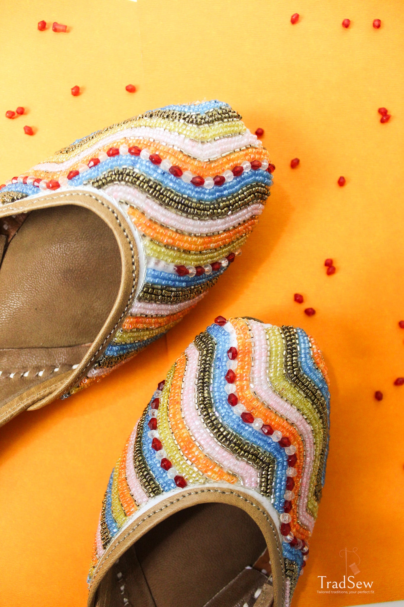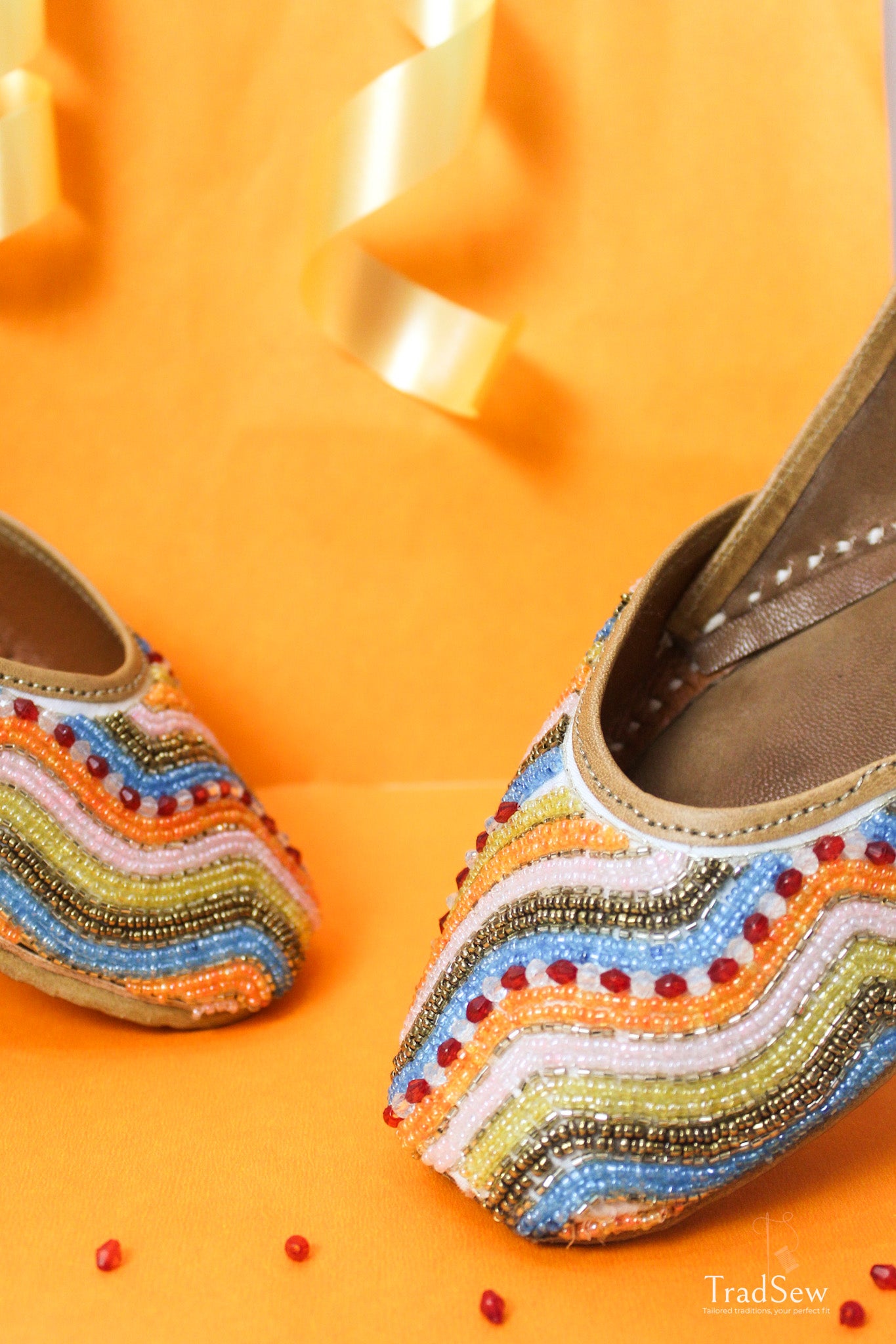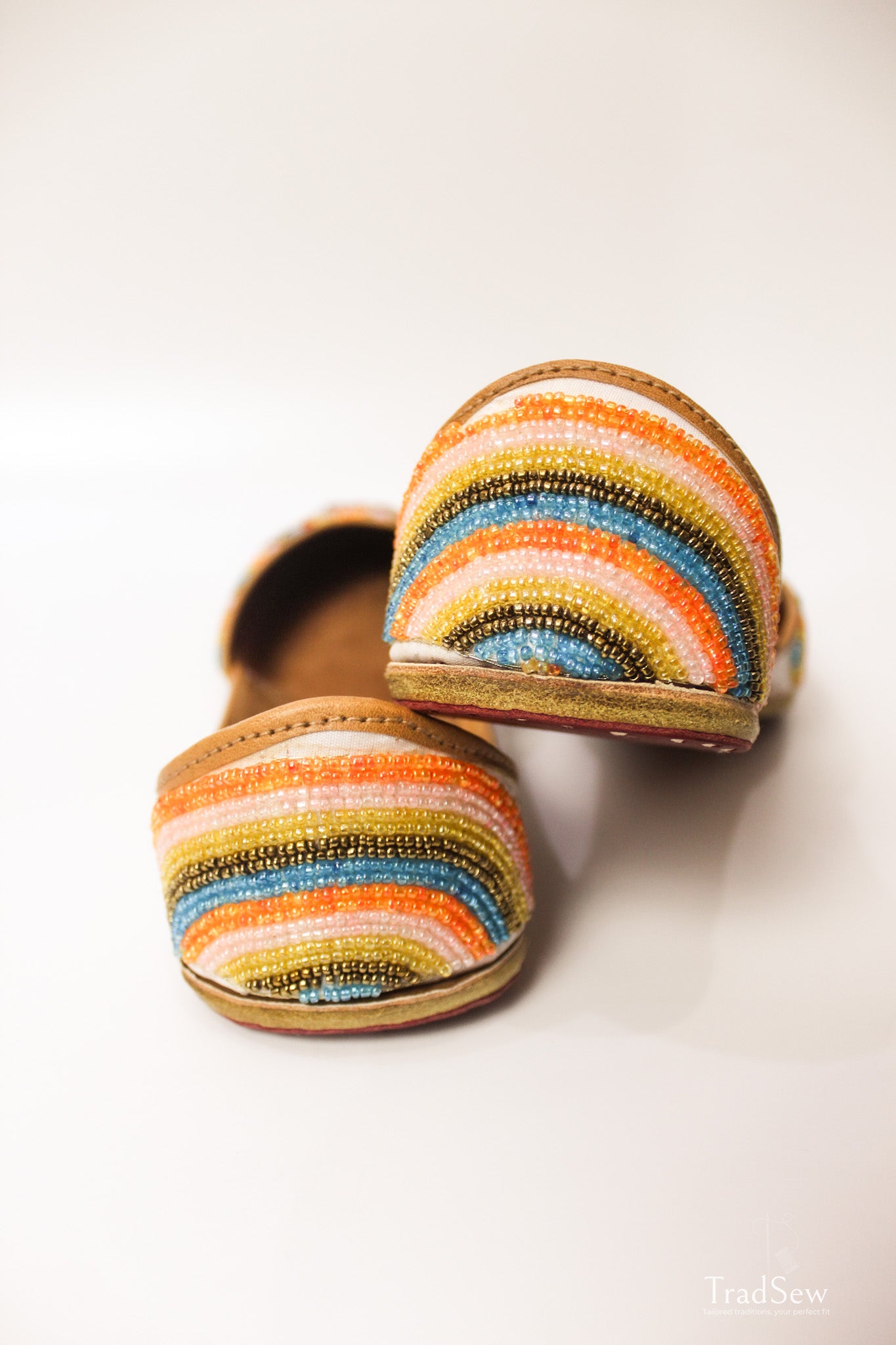 The Rangoli multicolor jutti is a stunning blend of tradition and modernity. Handcrafted with vibrant beadwork inspired by Indian rangoli art, this Punjabi jutti for women features meticulous detailing on premium leather for ultimate comfort and durability. This mojari is perfect for festive occasions or everyday elegance, its cushioned footbed ensures all day wearability.
