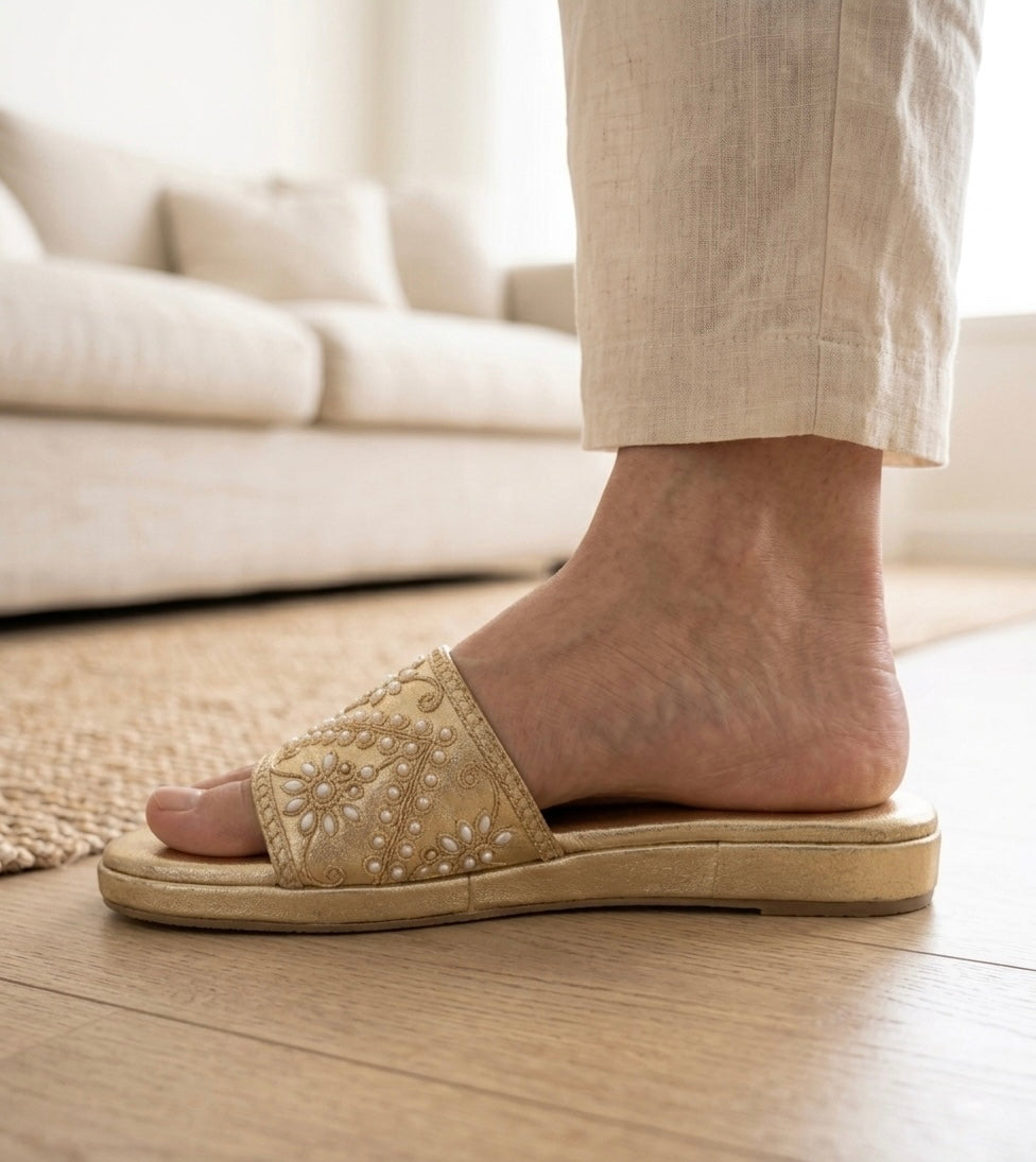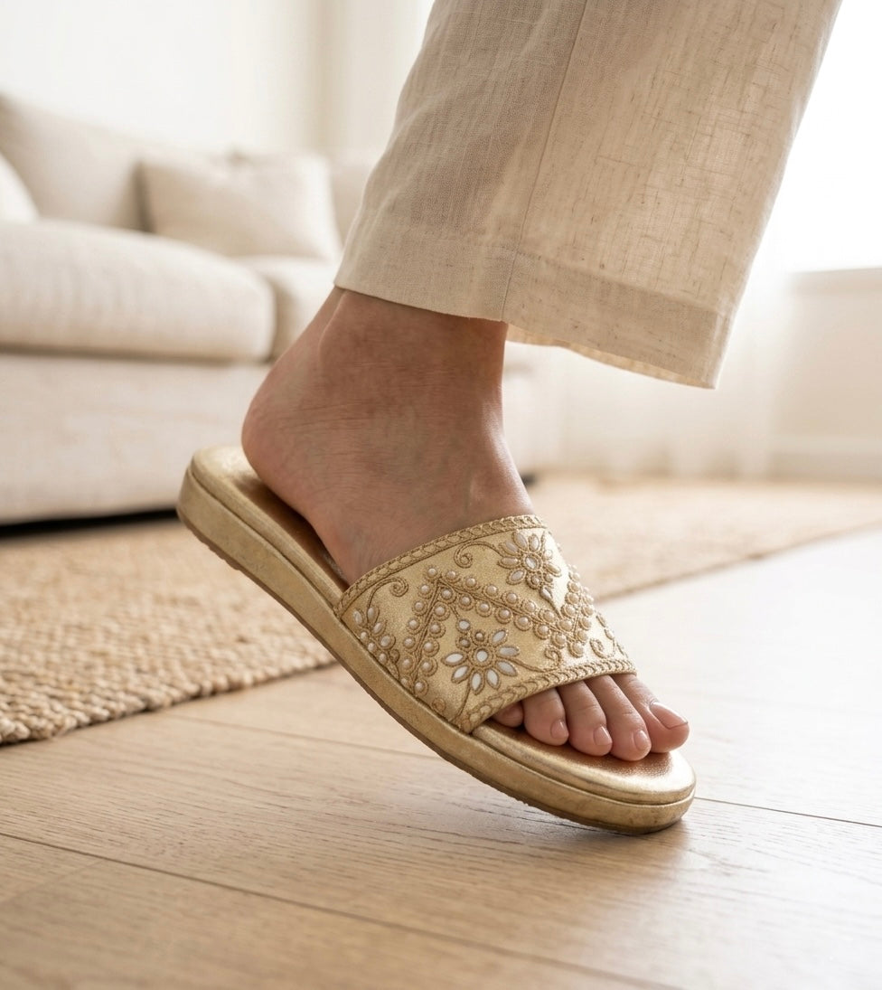 Meet the Rhubarb — a stunning flat slider that blends traditional aari-zardozi embroidery with modern comfort. Featuring intricate floral motifs on a warm gold base, this slider is crafted for women who appreciate artisanal beauty in everyday wear.