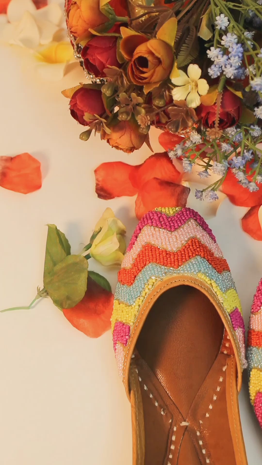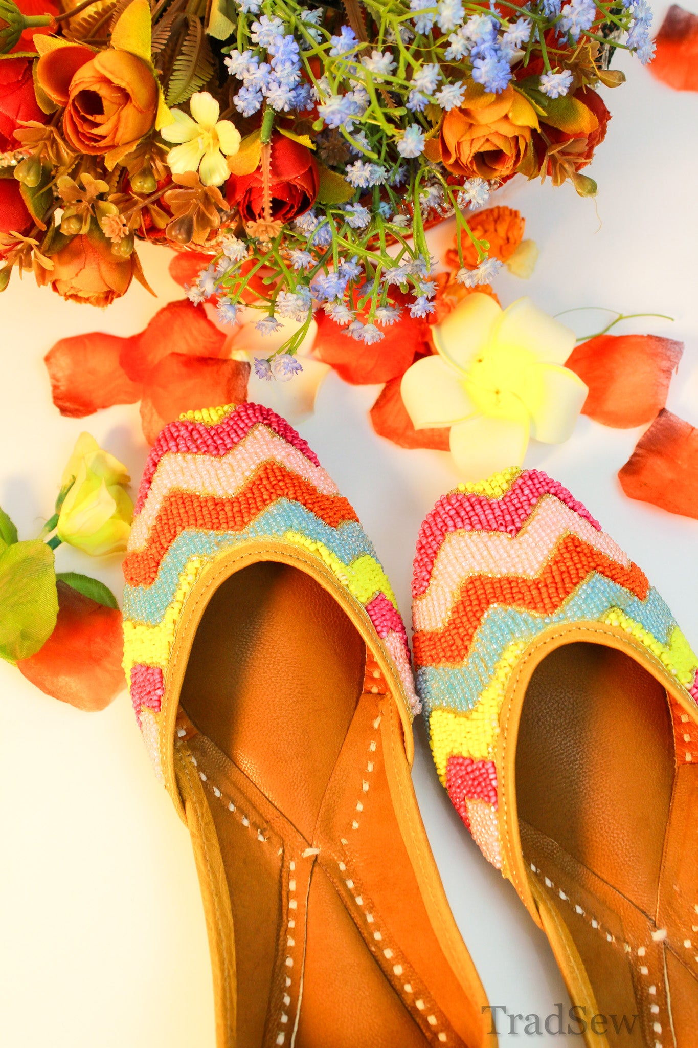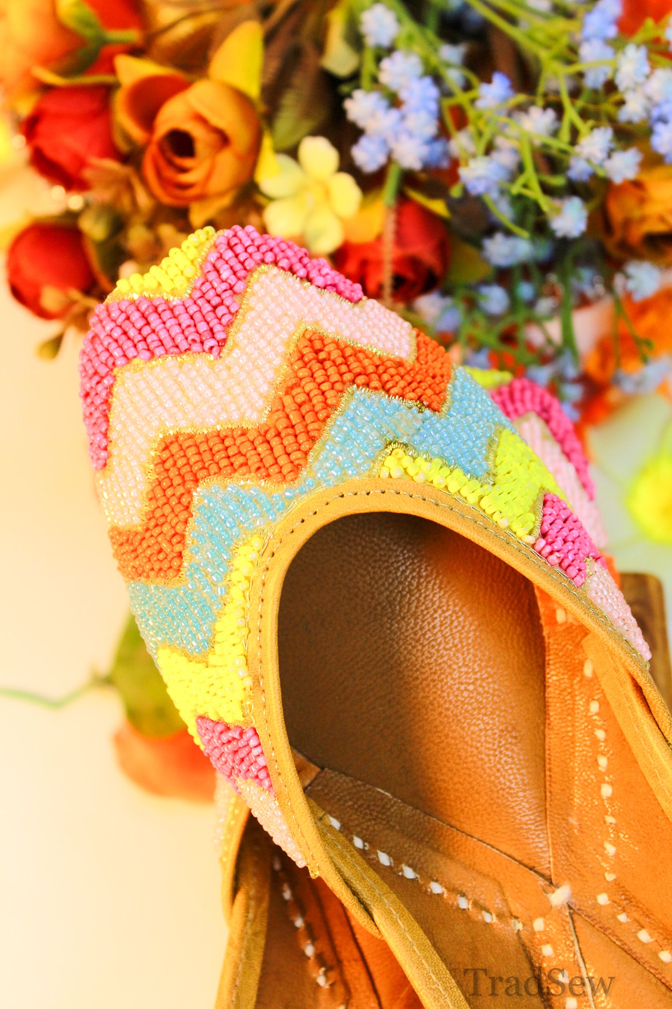 Introducing the SatRangi Chevron Leather Juttis by TradSew — a masterpiece that weaves together tradition and a burst of colors. The chevron pattern, meticulously created with beads, is reminiscent of India's diverse and vibrant culture, making each step you take a testament to the country's rich heritage.