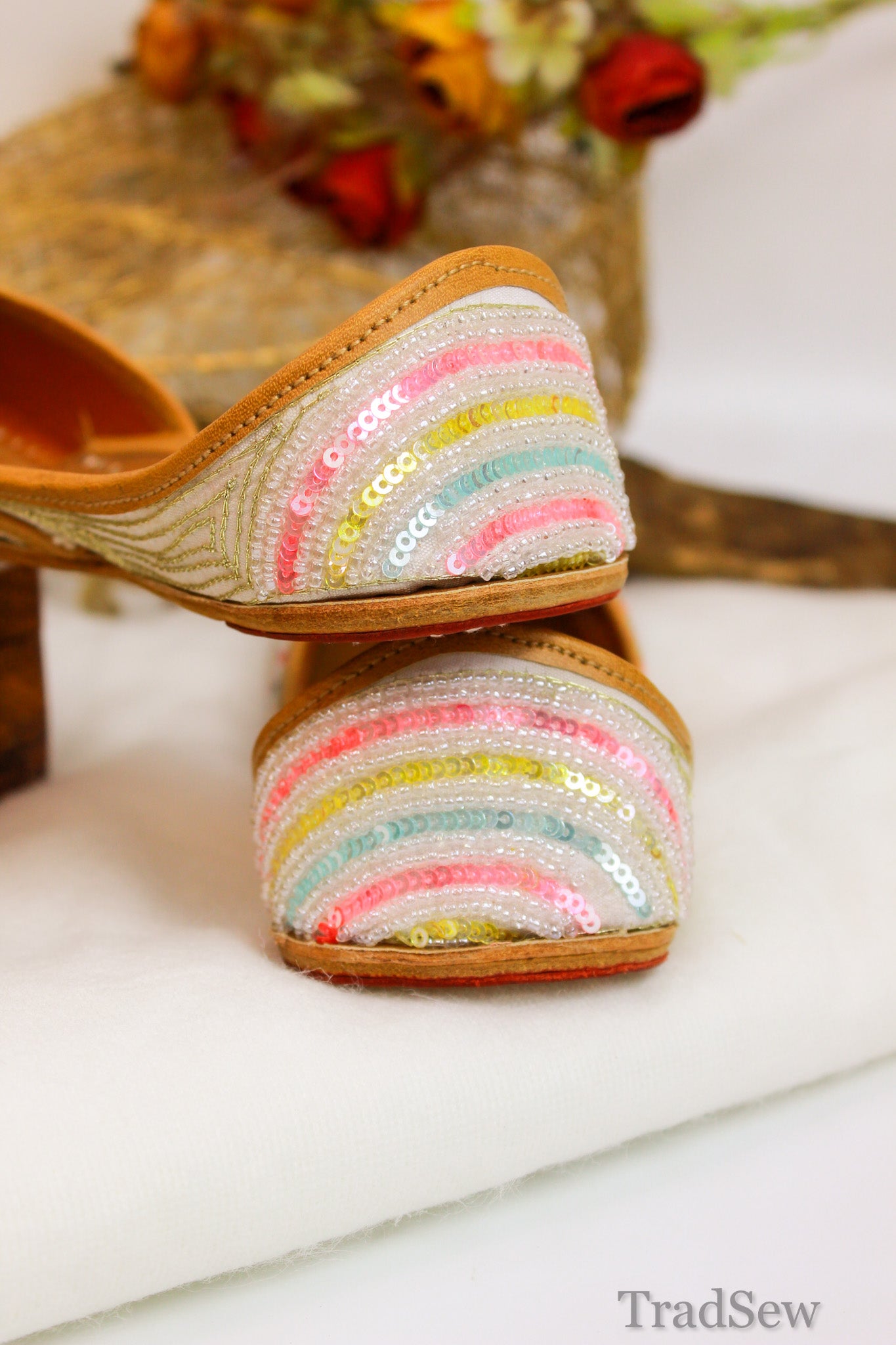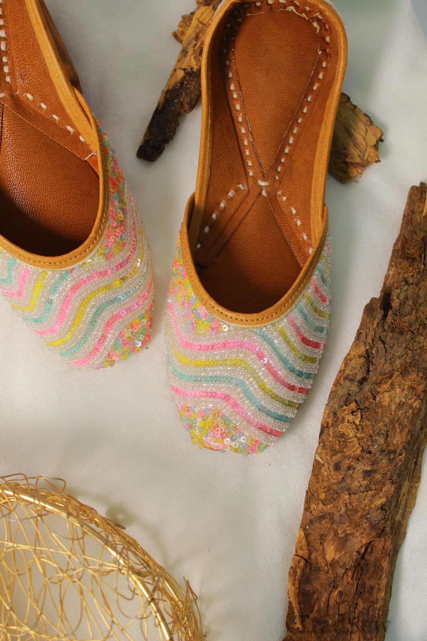 The Lehar Punjabi jutti for Women captures the essence of oceanic splendor. The wavy sequin design reflects the shimmering dance of light on the water’s surface, reminiscent of the serene movement of waves. This design, not just a feast for the eyes but also a delight for the wearer, ensures both elegance and comfort. Crafted to echo the rhythmic beauty of the sea, these juttis are a tribute to the calming influence of the ocean’s timeless flow.