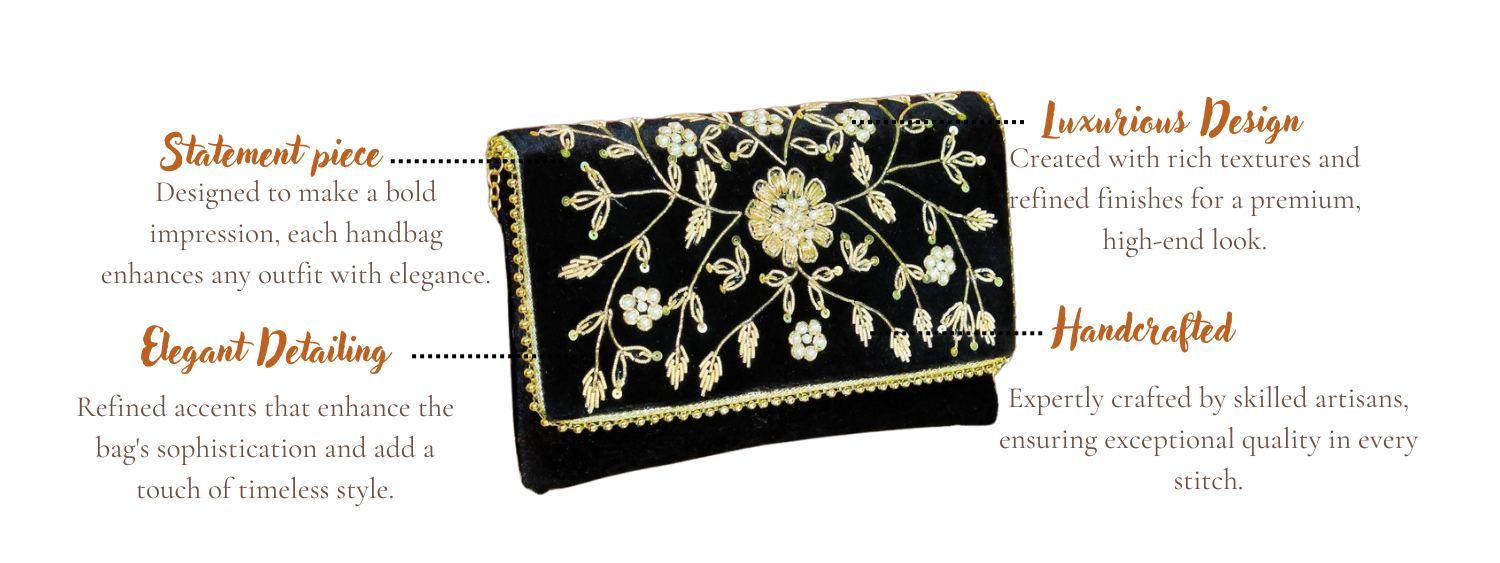 As you step into the beautifully decorated wedding venue, the lights twinkle like stars, and soft music fills the air. Dressed in your stunning outfit, you clutch the Shobha Black Flapbag, its elegant design perfectly complementing your look. While mingling with the guests, someone stops mid-conversation to admire your bag. “Wow, that’s gorgeous! Where did you get it?” another guest chimes in, “It’s so unique, and it goes perfectly with your outfit!” Smiling, you gracefully thank them, feeling confident and radiant.The Shobha Black Flapbag isn’t just a bag,it’s your partner in making unforgettable memories and stealing the show at any celebration.